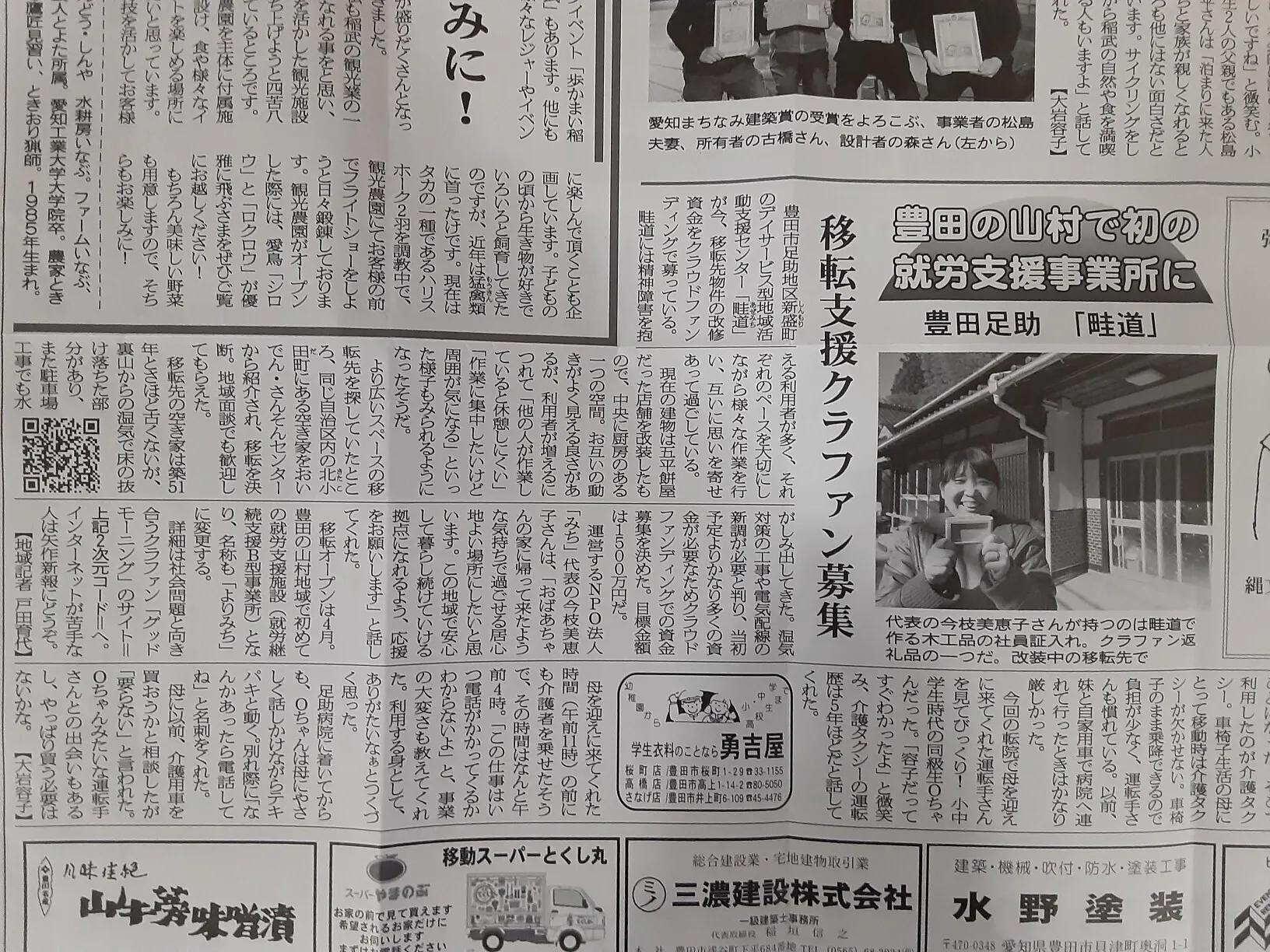 愛知県豊田市とみよし市の地域新聞『矢作新報』に、移転先の改修のことやクラウドファンディングに挑戦している記事を掲載していただきました!