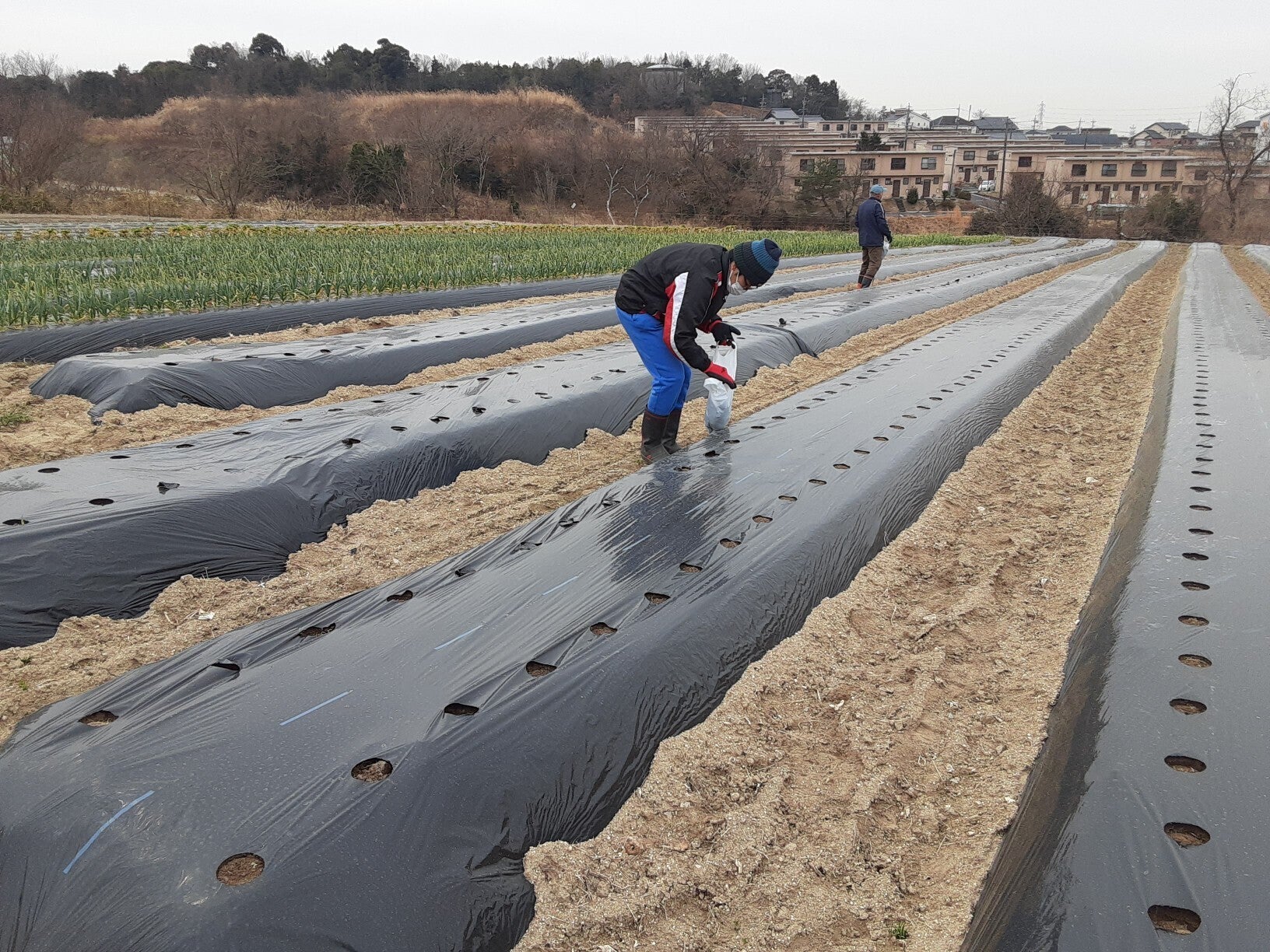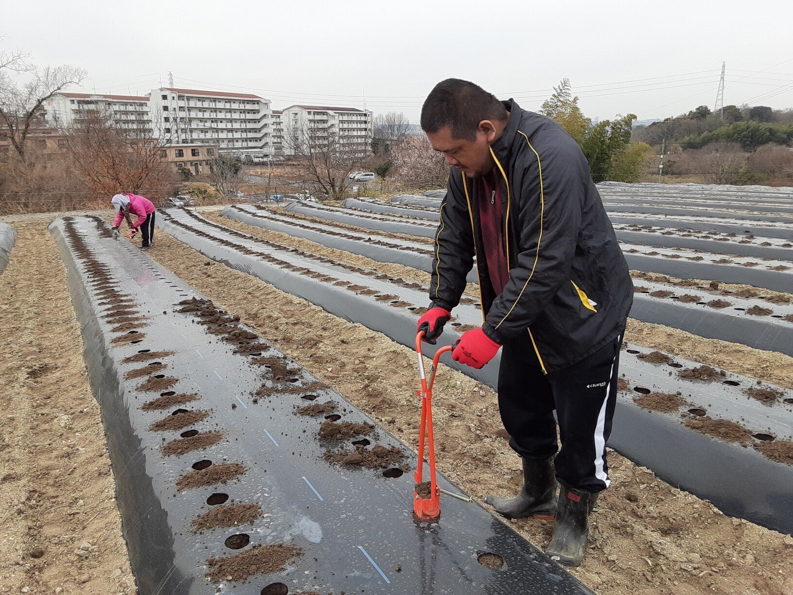 同じ時間帯に、豊田市内では農福連携を引っ張っている社会福祉法人無門福祉会さんもいらっしゃいました。無門さんがじゃがいもの植え付けができるよう、私たちはじゃがいもを植える穴を開け、連携してお仕事をしました。