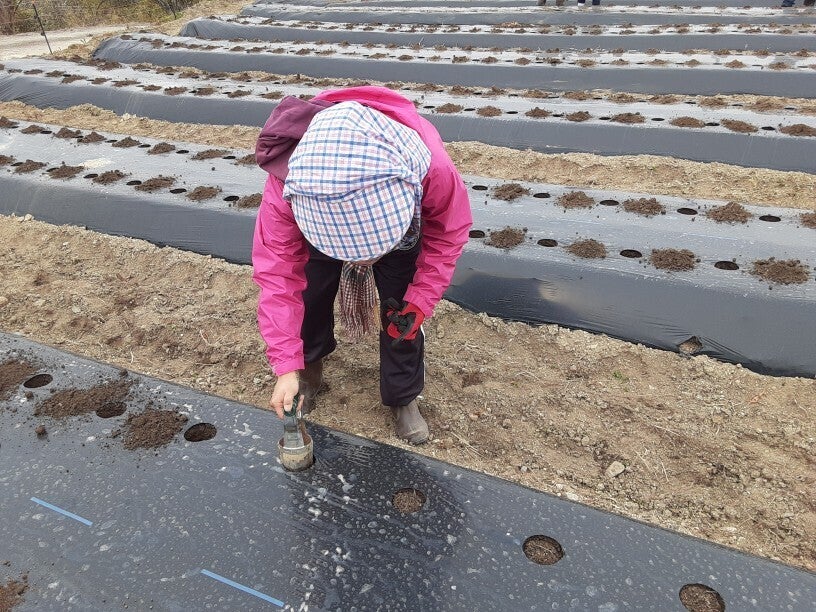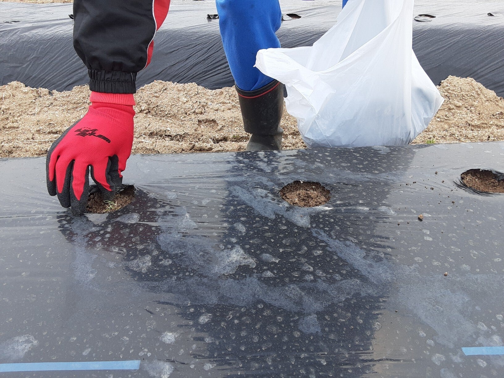 マルチシートにバーナーで穴を開け、そのビニールゴムを拾っています。