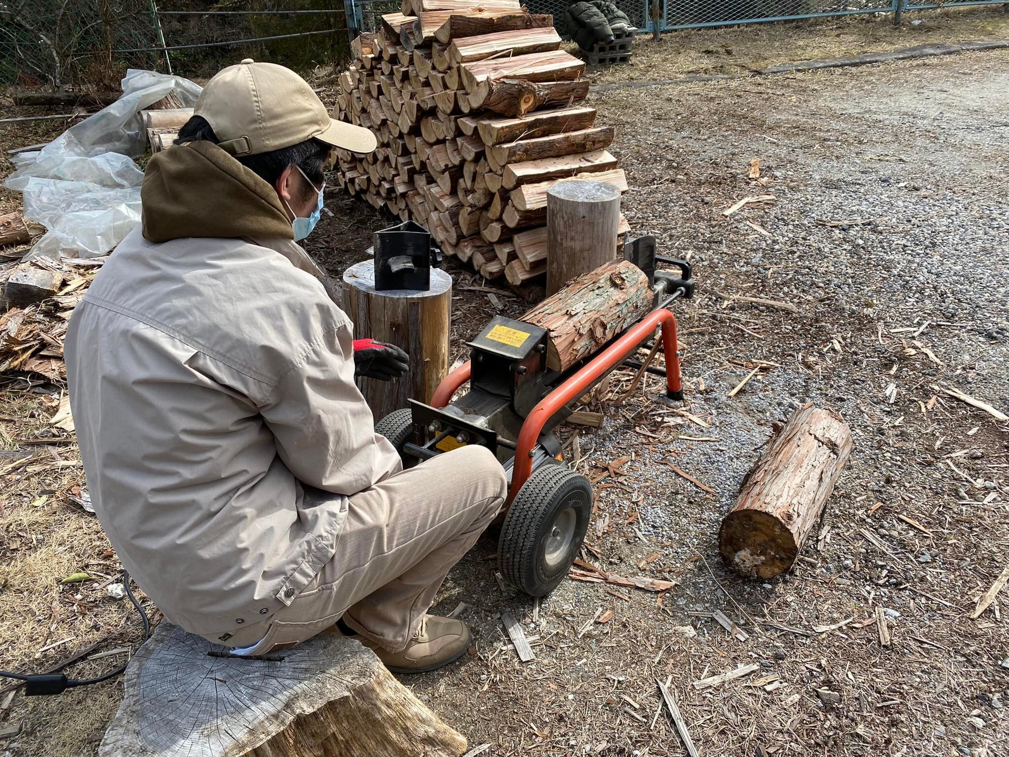 薪割り機での薪割り。割れた時の木の香りに癒されます。