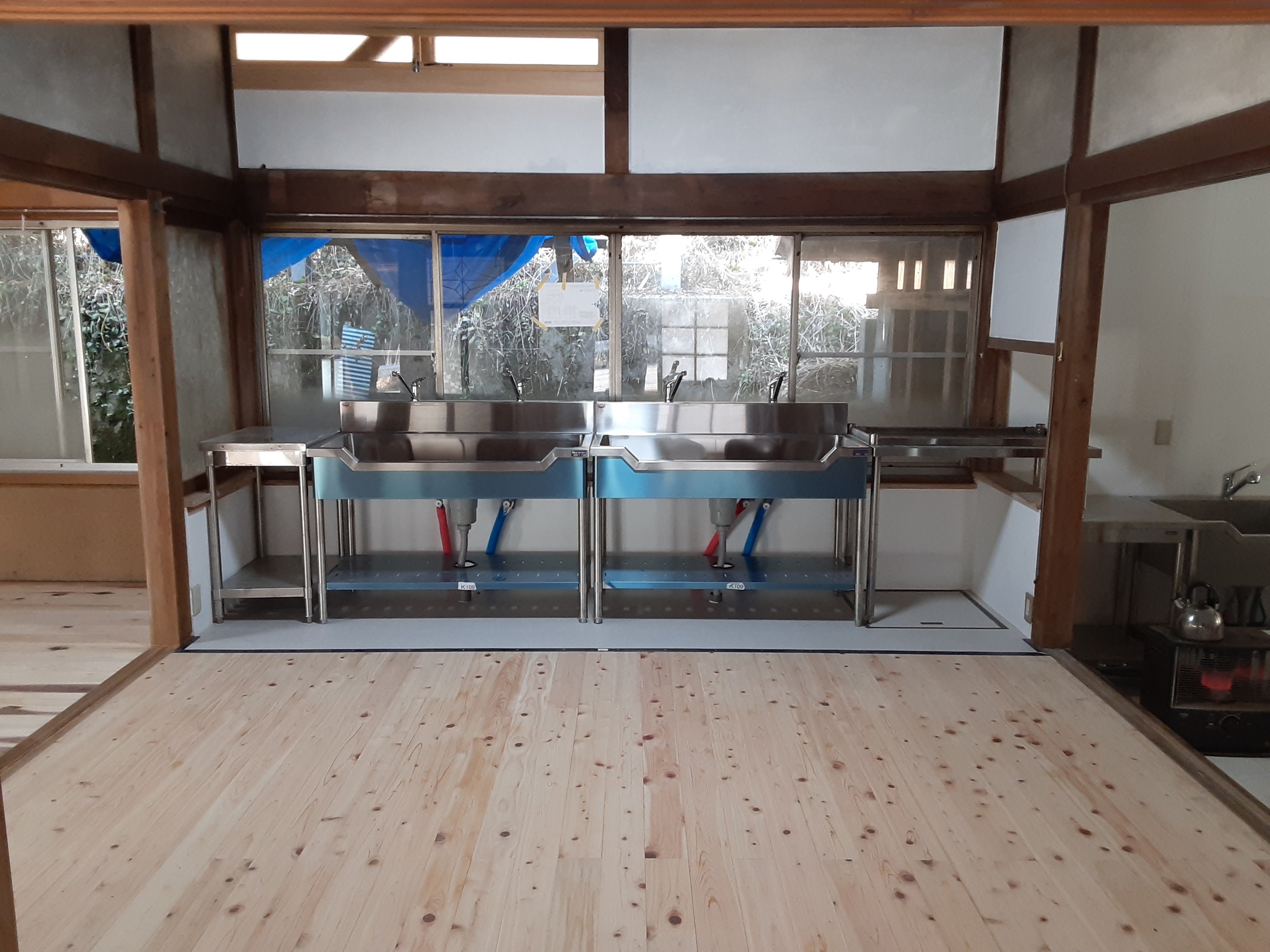談話室と洗面所(昼食後の食器洗いの流し台としても使用します)
