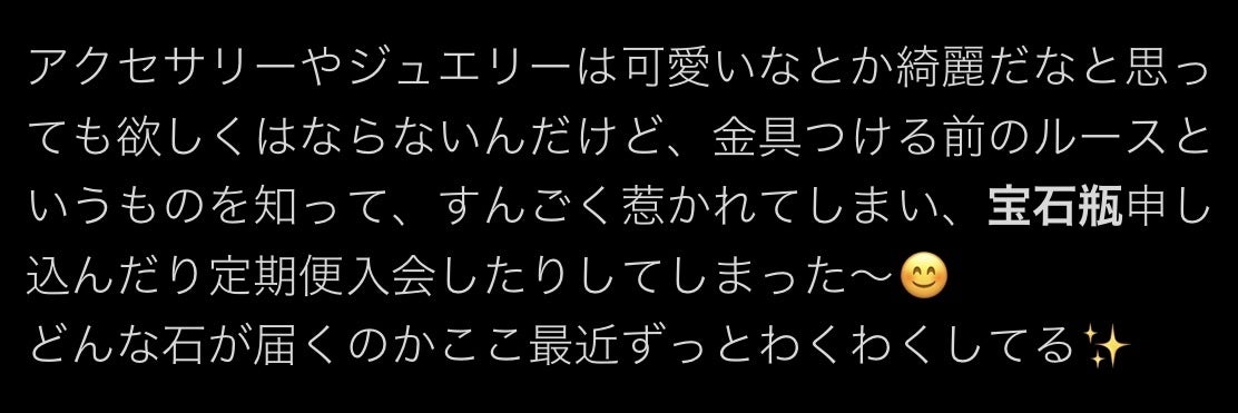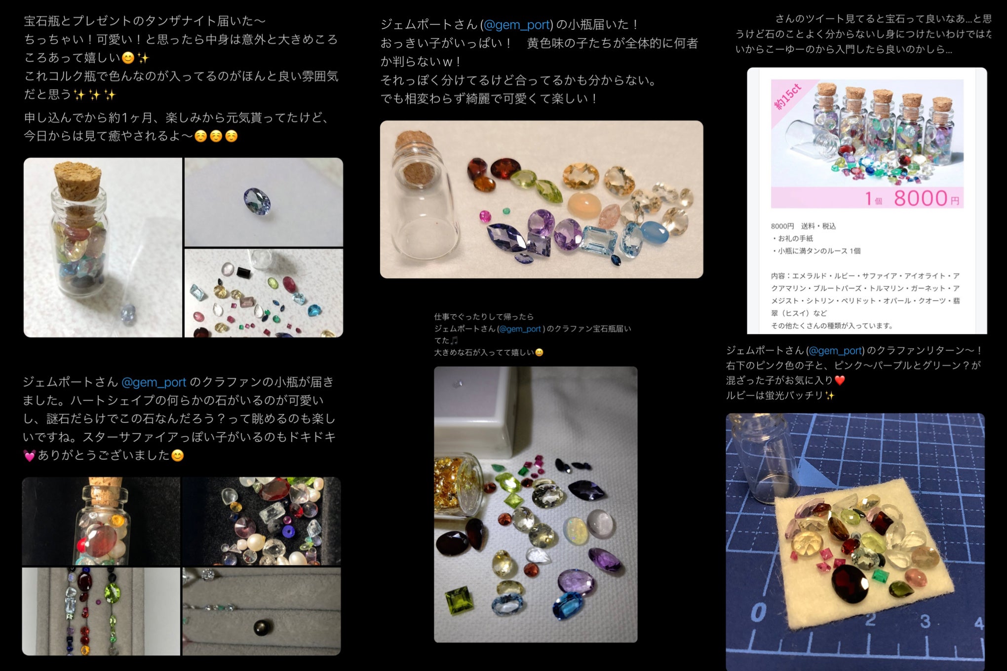 子どもの頃から宝石の写真を眺めるのが好きで、30歳を越えた今も、疲れた時に宝石の画像を検索して癒されているくらいには大好きです。パワーストーンも原石も好きですが、やはり一番はルースでしょうか。瓶に詰まったルース、楽しみです。