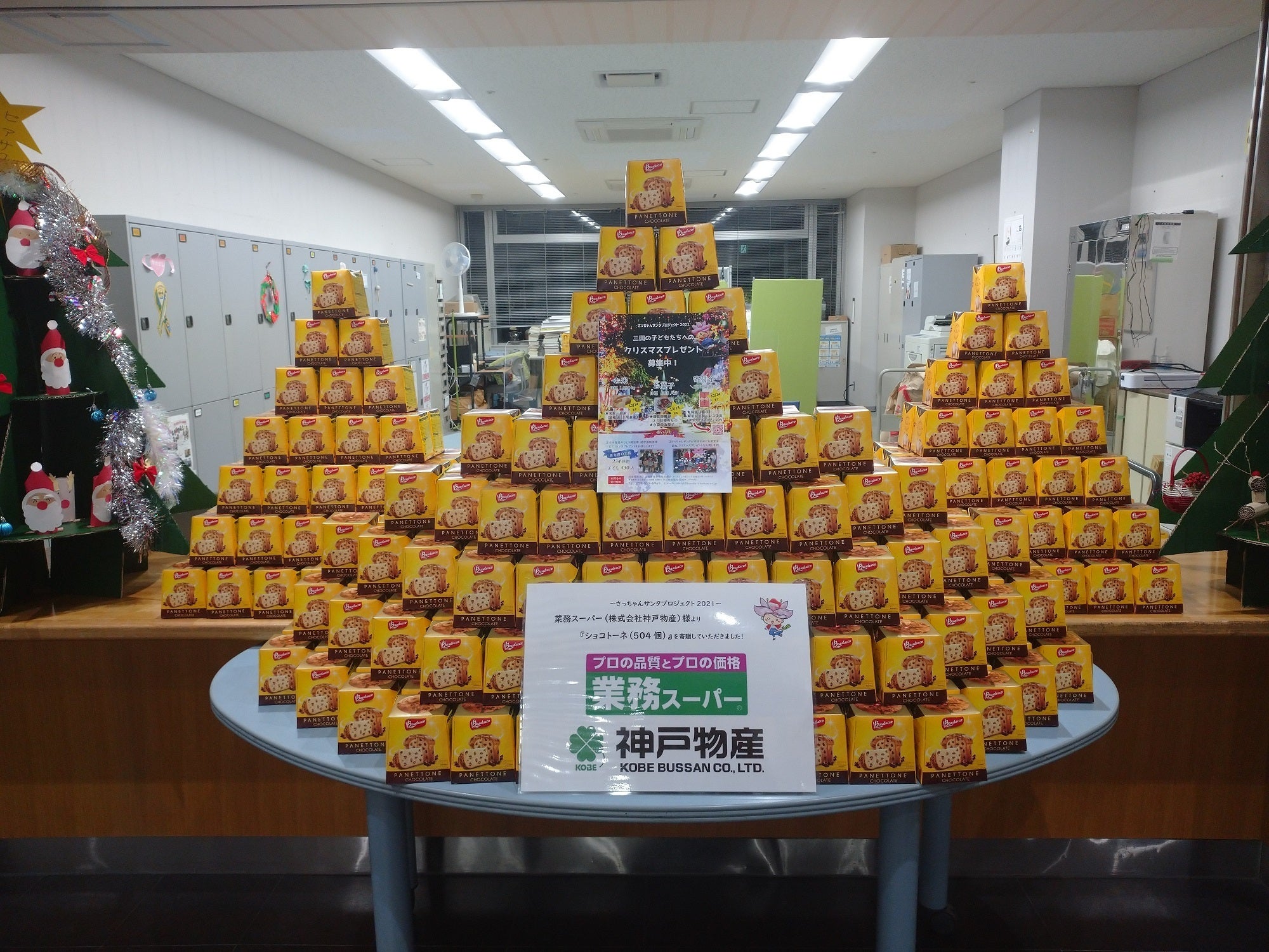 「三田の子どもたちのために」と続々と寄付の申し出を頂いています。全国に業務スーパーを展開している㈱神戸物産様からは、海外でクリスマスの時期に食べられているお菓子『ショコトーネ』504個を寄贈していただきました。子どもひとりに1個ずつ、もれなくプレゼントさせていただいています!