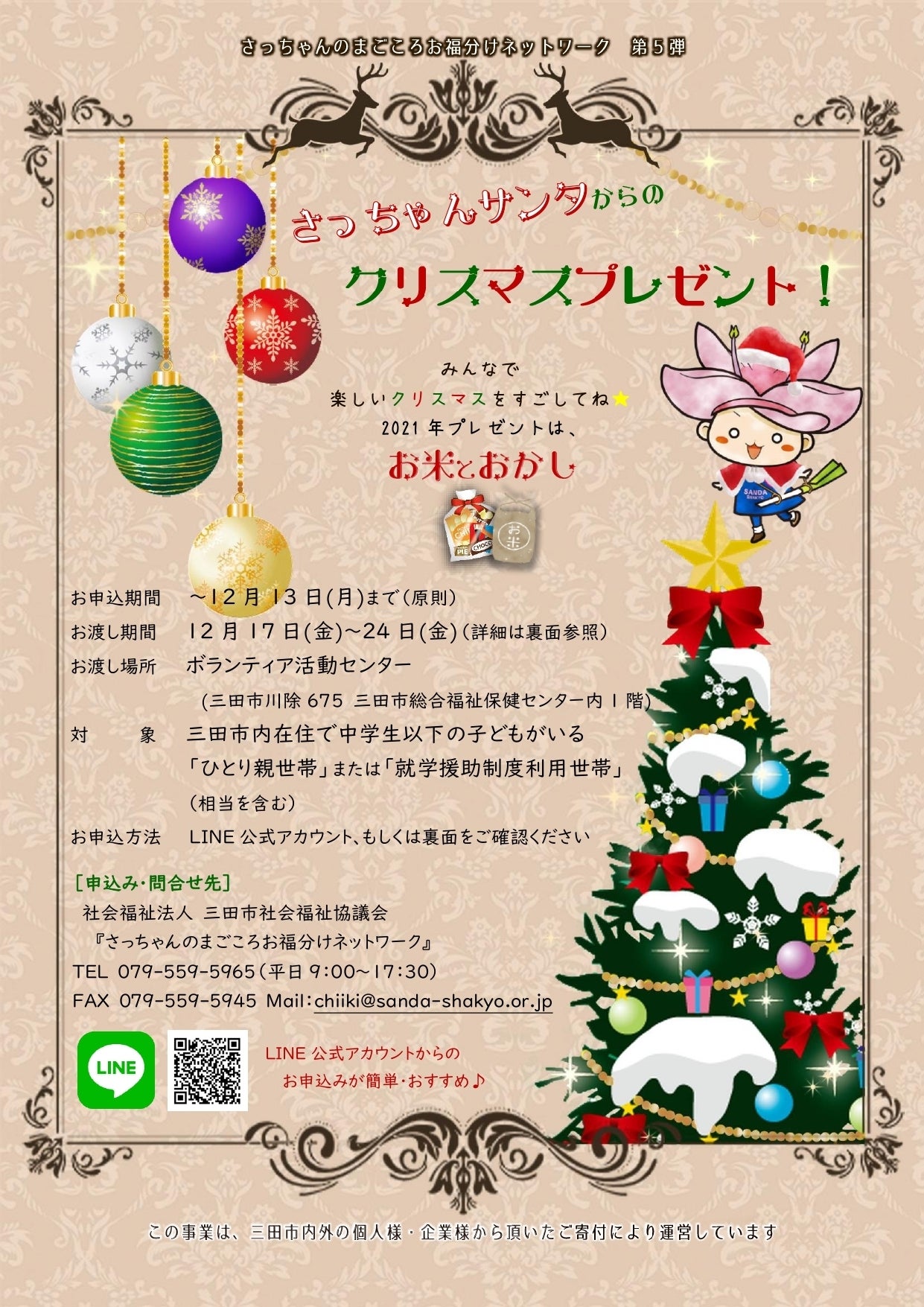 12/3(金)より、クリスマスプレゼントの受け取りを希望するひとり親世帯・就学援助世帯からの申込み受付をスタートしました。 市内約70か所の幼稚園・保育園・小学校・中学校(全児童)にチラシを配布した他、LINE登録して頂いている約580世帯にメッセージでお知らせしました。