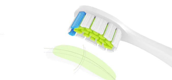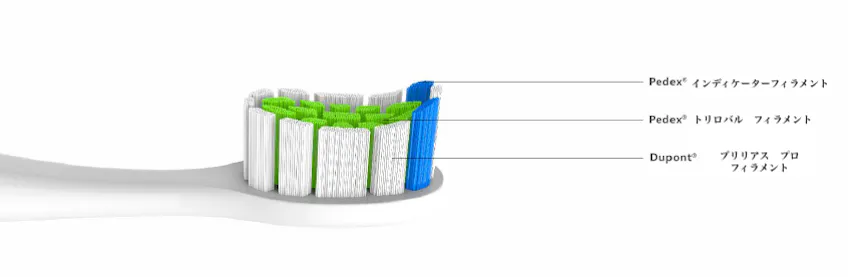 ブラシヘッドは、アメリカデュポン社のトライアングルダイアモンドブラシと、ドイツPEDEXの色褪せによって交換時期をお知らせしてくれるブラシヘッドを採用しています。また、歯にしっかりとフィットするDual 3Dと呼ばれるカーブを描いたヘッドで、磨き残しを完全に防ぎます。