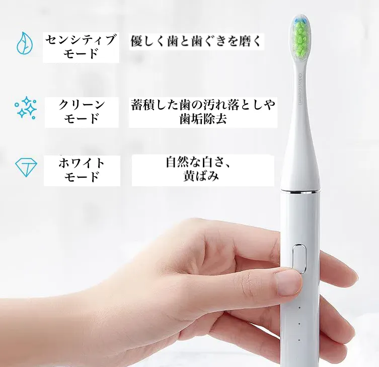 優しく歯と歯茎を磨きたい時は「センシティブモード」、いつもよりしっかりと磨きたい、蓄積した歯の汚れ落としや歯垢除去をしたいときは「クリーンモード」、歯の黄ばみが気になる時は、黄ばみ除去が期待できる「ホワイトモード」の3種類のケアモードが選べます。