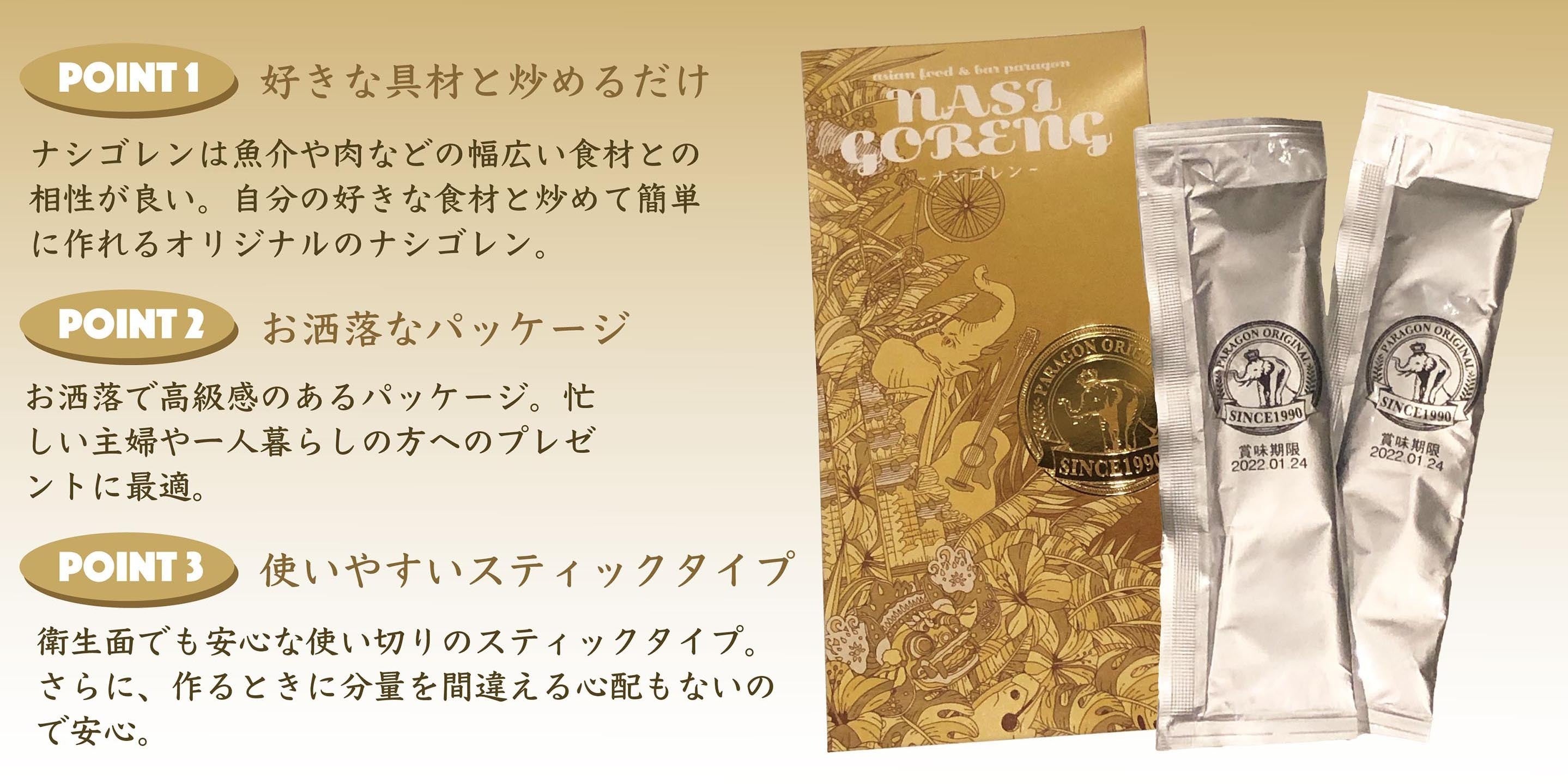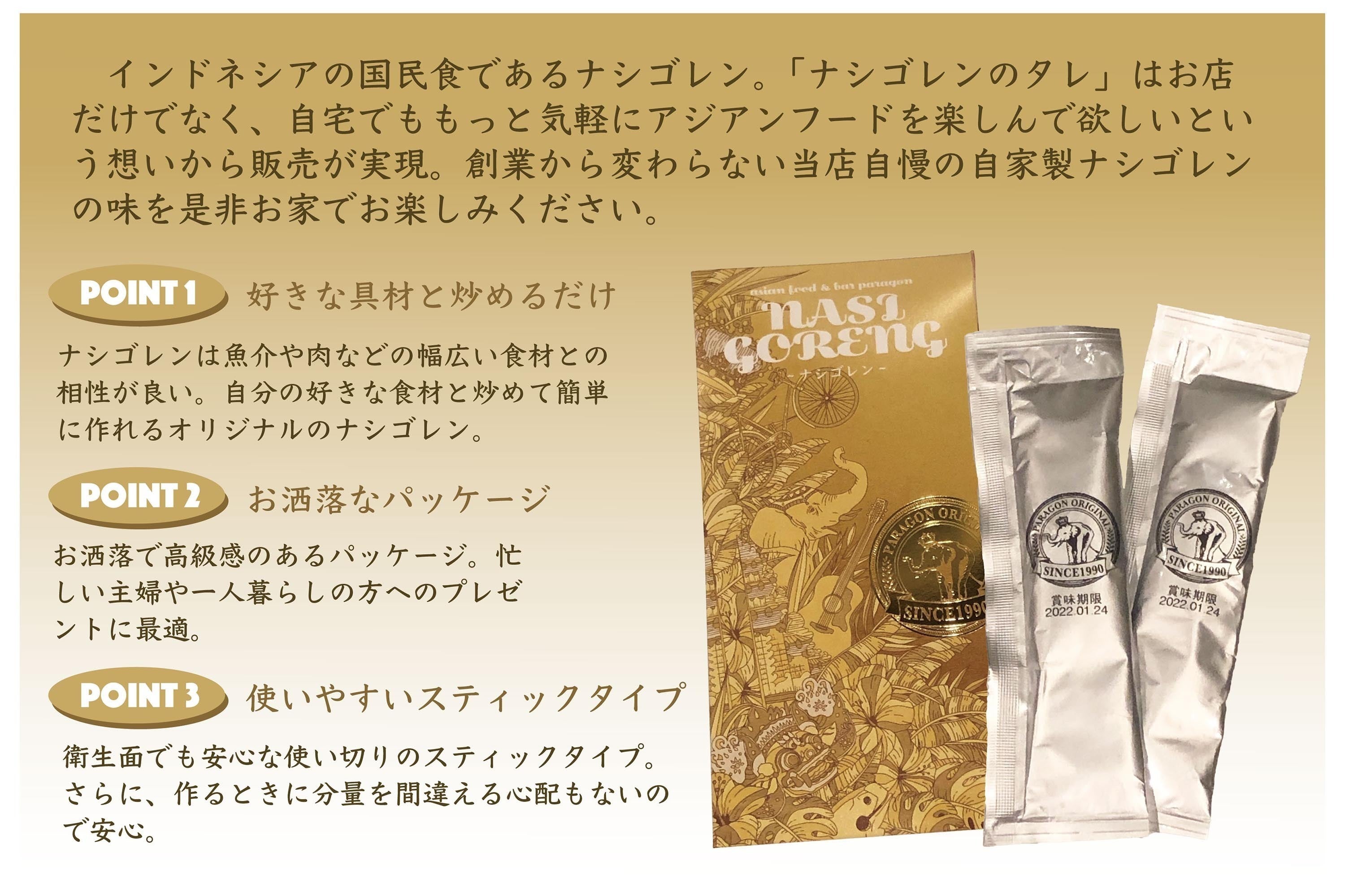 インドネシアの国民食であるナシゴレンはParagonでも大人気メニューの1つです。「ナシゴレン のタレ」はお店だけでなく自宅でももっと気軽にアジアンフードを楽しんで欲しいという想いから、創業30年を記念に販売が実現しました。創業から変わらない当店自慢の自家製ナシゴレンの味を是非お家でお楽しみください。