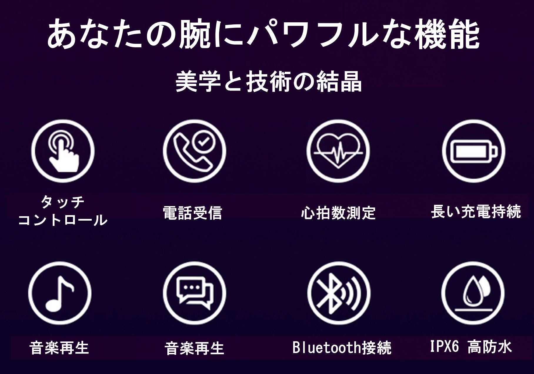 また、電話の受信、メールの通知、イヤホン本体やスマートウォッチをタッチすることで操作性など機能がシンプルでありながらも充実した商品となっております。