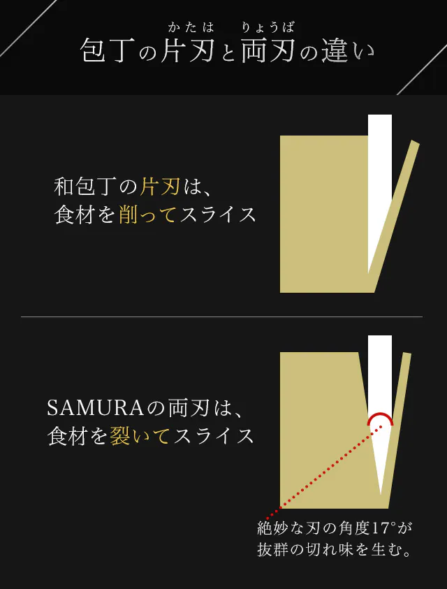 刃の角度を17°にすることで食材に真っすぐ当てれば潰さず薄く切れ、且つ食材の刃離れが良い包丁に仕上げています。