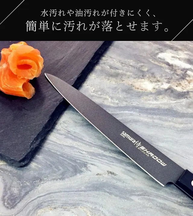 【SHADOW】はご家庭でのタフな使用を想定してブレードにフッ素コーティングを施し、食材の「刃離れ」が良く、汚れが付きにくい包丁に仕上がっています。