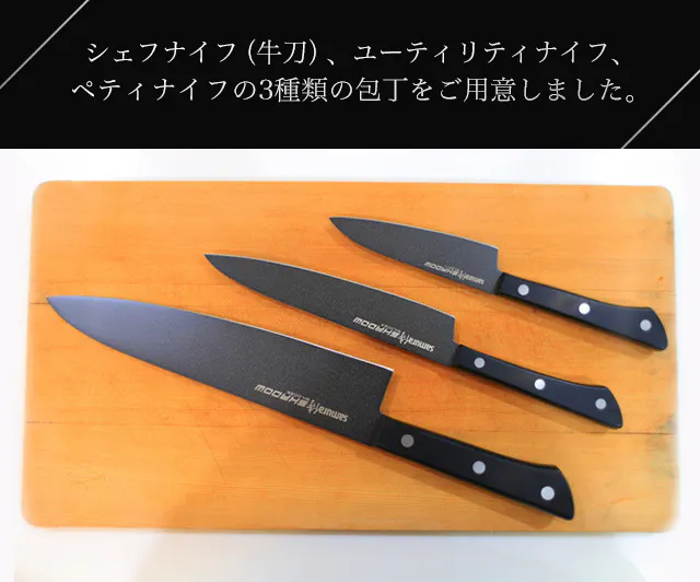 今回もあなたの料理に合わせシェフナイフ(牛刀)、ユーティリティナイフ、ペティナイフの3種類の包丁をご用意しました。