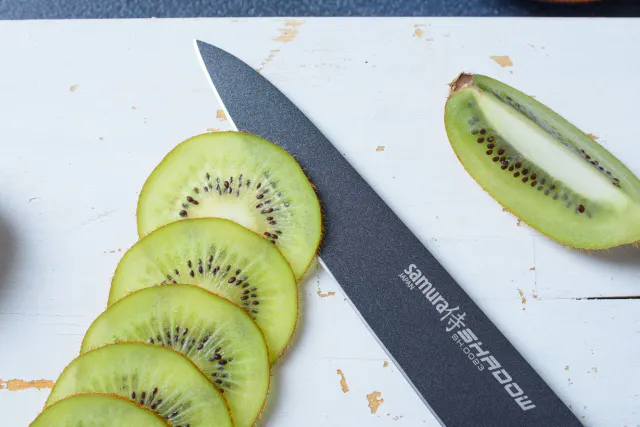 そのため潰れやすく薄くスライスするのが難しいキウイフルーツも、軽く刃を当てるだけでこんなに薄くスライス。