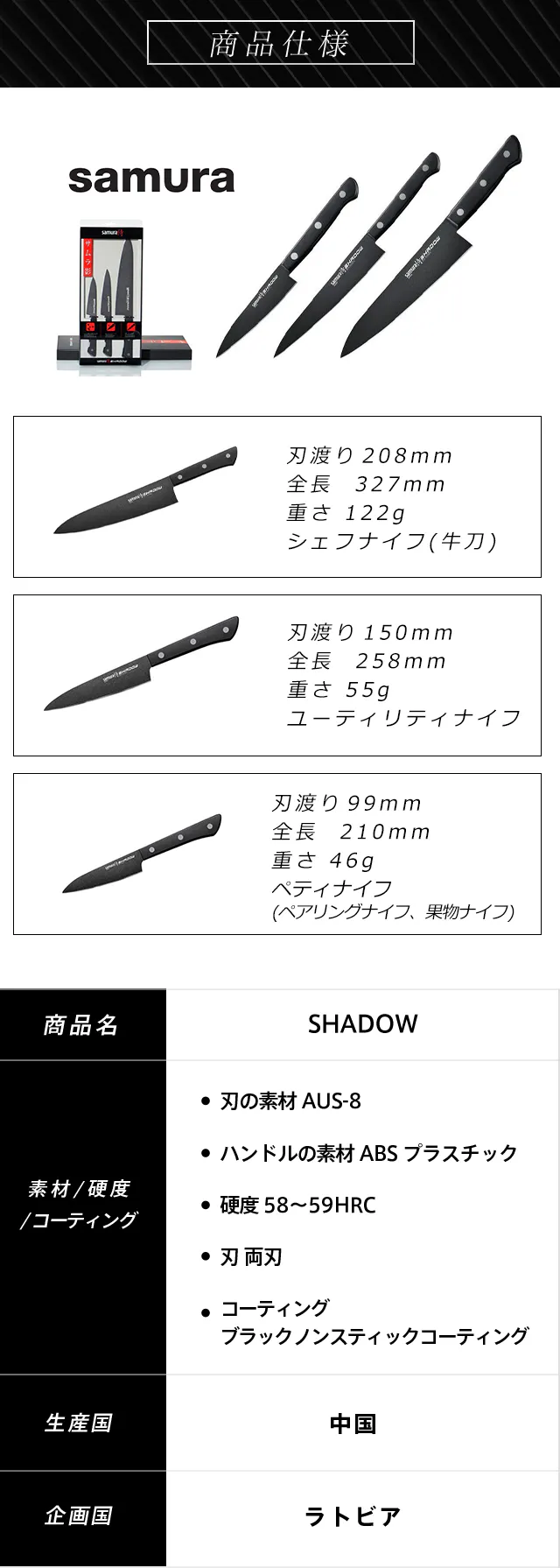 今回ご紹介させていただく“SAMURA”の包丁は、漆黒のブレードが美しい新作の【SHADOW】です。