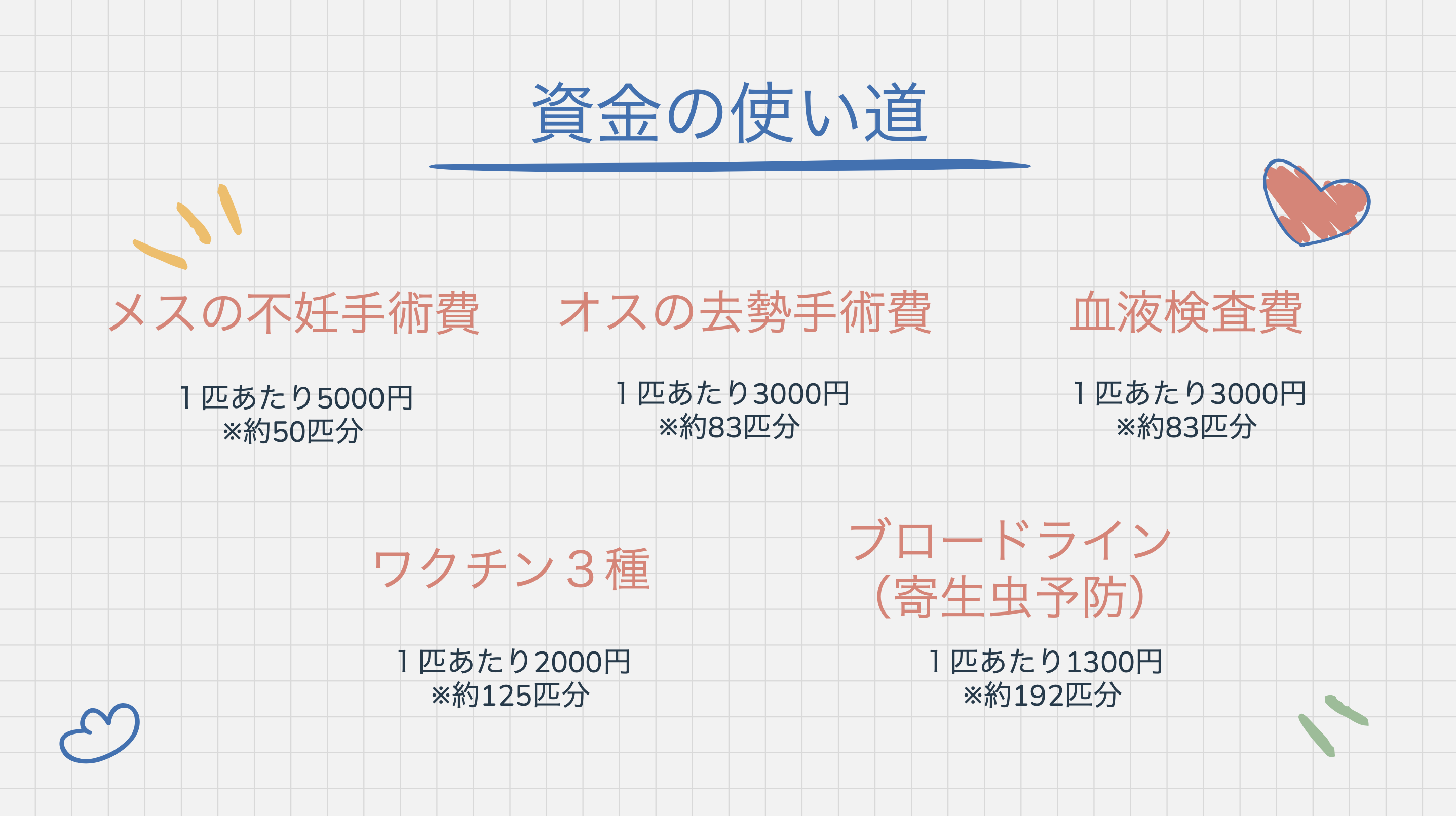 皆様からご支援して頂いた資金から上記の手数料を引き、それ以外(249,000円)は全て動物福祉団体Pawer.を通して保護犬猫(野外犬猫も含む)の不妊去勢手術費用、そしてそれに伴う医療費に充てます。