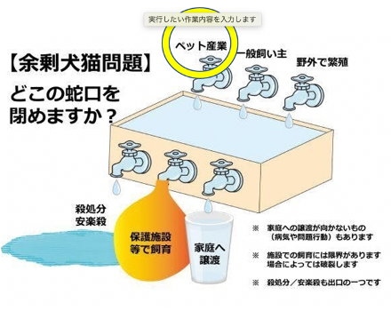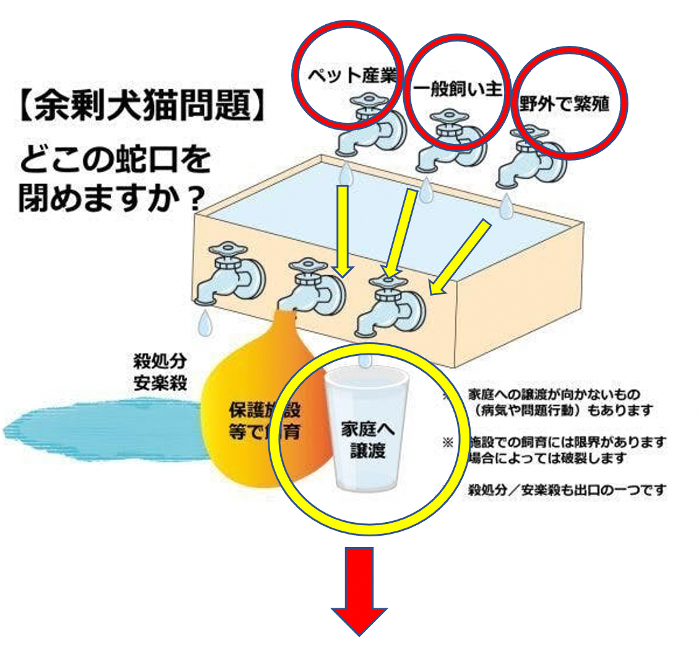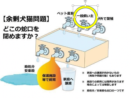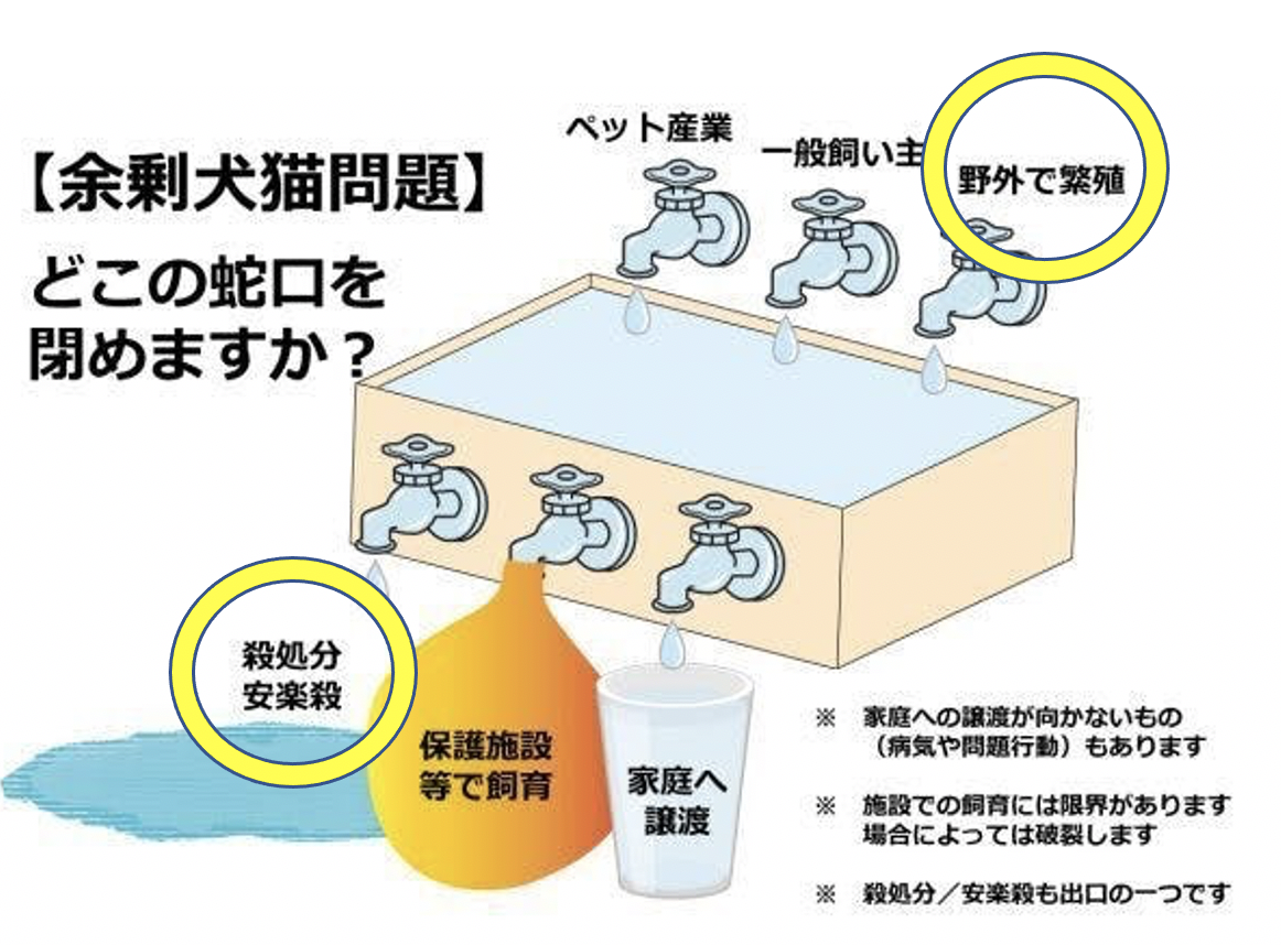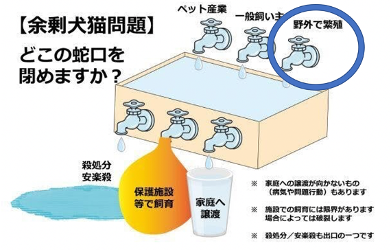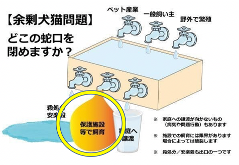 参考文献:人と動物の共生センター."余剰犬猫問題ー蛇口モデル". 人と動物の共生センターブログ. http://human-animal.jp/about/tap-model, (更新日 2017-11-4). (参考日 2021-12-23)