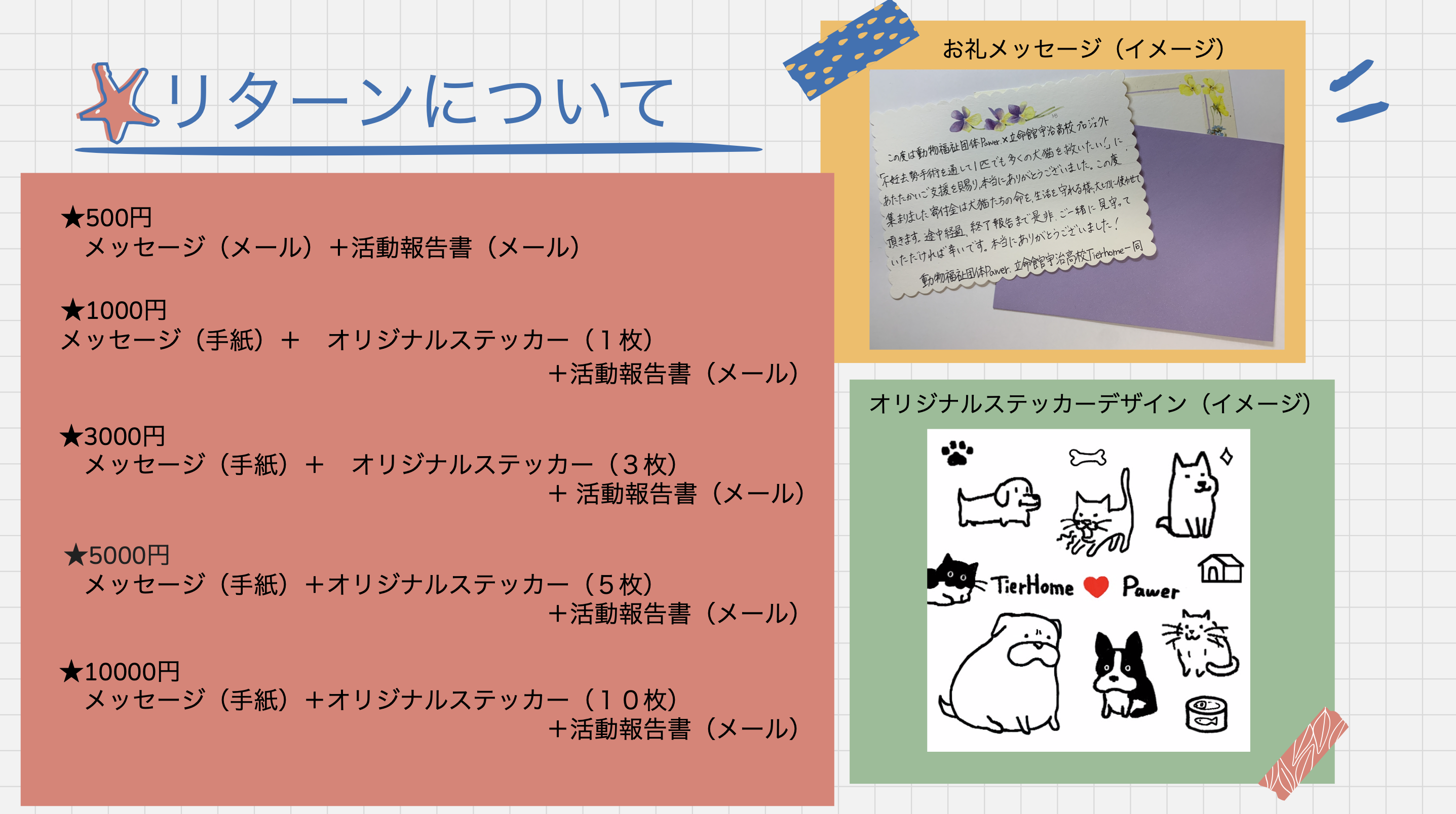 最後までご覧いただきありがとうございます。私たちTierhomeは1匹でも多くの犬猫を殺処分から救うことを目標としています。不妊去勢手術を推進することにより、犬猫の過剰繁殖を防ぐことができます。そして、これらの取り組みが傷つく犬猫を減らしていくことに繋がると考えます。私たちは、犬猫が幸せに暮らせるようになることを信じています。私たちと同じように命をもって生まれてきた犬猫たちが理不尽な理由によって当たり前の日常を送るという幸せを奪われ、殺処分されています。犬猫も私たち人間と同じ、生き物です。全ての犬猫がよりよく生きていくためにみなさんのサポートが必要です。