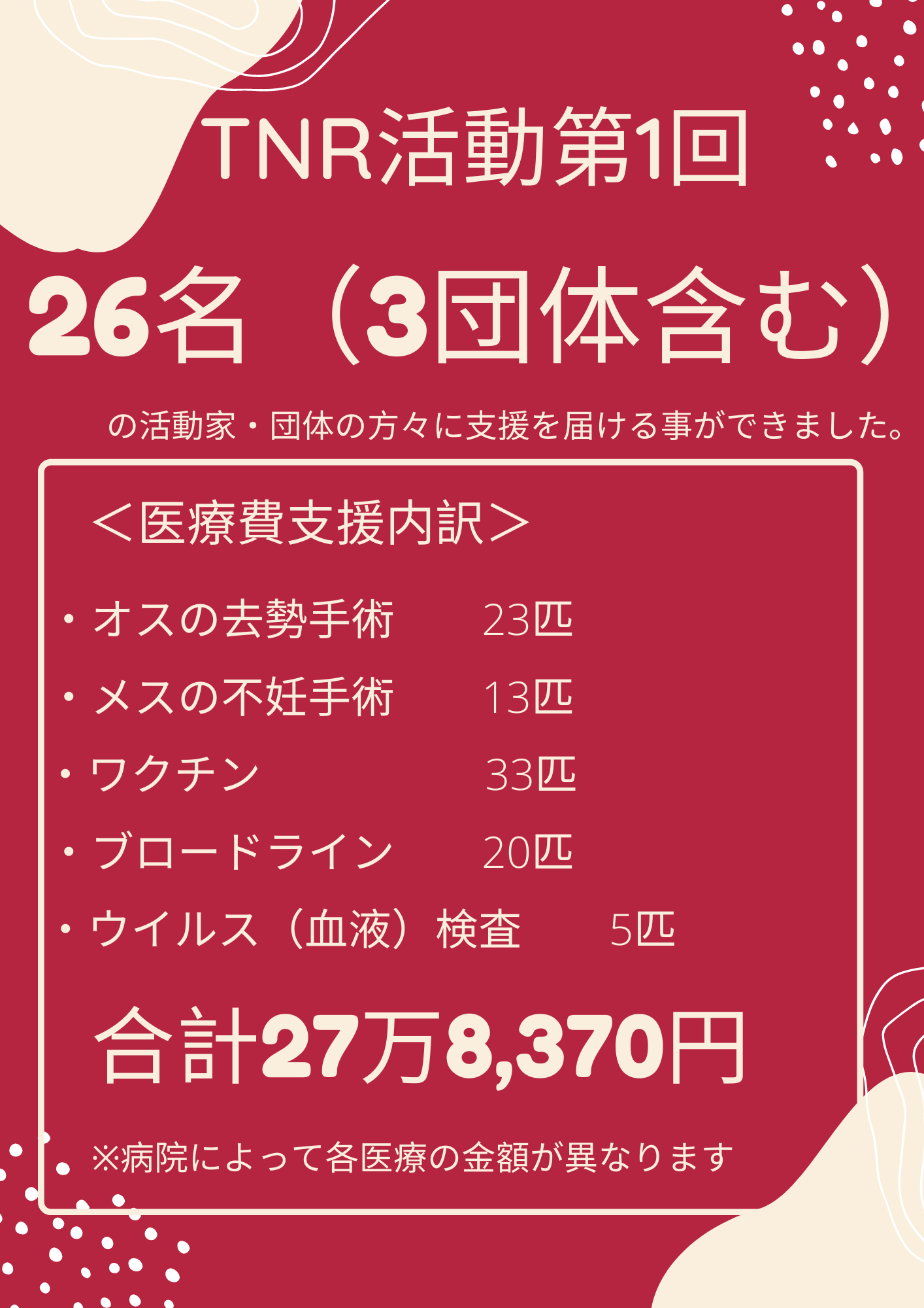 2022/05/13 21:002022年2月末ごろから、動物福祉団体Pawer.さんによりクラファンTNR支援申請を開始してくださり、その第一弾(2022年2月27日開始〜3月31日締め切り分)の結果報告です。皆様からご支援して頂いた支援金は、動物福祉団体Pawer.さんにご協力頂き、多くの活動家・団体の方々に届ける事ができました。ご支援してくださった皆様をはじめ、いつもたくさんのサポートしてくださっている動物福祉団体Pawer.さん、そしてTNR活動をしてくださっている活動家・団体の皆様、本当にありがとうございます!!引き続き、見守っていただけると幸いです。よろしくお願いいたします! もっと見る