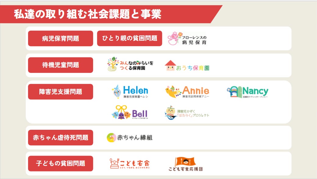 「親子の笑顔をさまたげる社会問題を解決する」をミッションに様々な保育・福祉事業や政策提言活動を展開する認定NPO法人です。低価格な病児保育の提供などを通じたひとり親家庭の支援は13年の実績があります。経済的に困窮する世帯に食品を配送することをきっかけに見守りの支援を届ける「こども宅食」の活動を推進し、「こども宅食応援団」を連携しながら全国の支援団体へ立ち上げ・伴走支援を行っています。