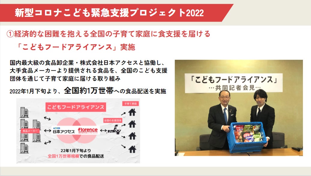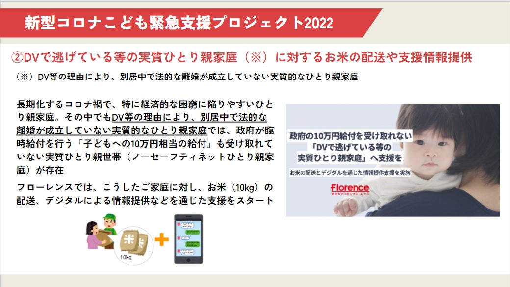 感染の再拡大が起こった2022年1月からは、「新型コロナこども緊急支援プロジェクト2022」を始動し、全国の経済的に困難を抱える子育て家庭やひとり親家庭、DVで逃げている等の実質ひとり親家庭(※)など、支援が届きにくく困難な状況に陥りやすいご家庭に対して、食品・日用品の配送や保育の提供、政策提言活動などを通じた緊急支援を行っています。