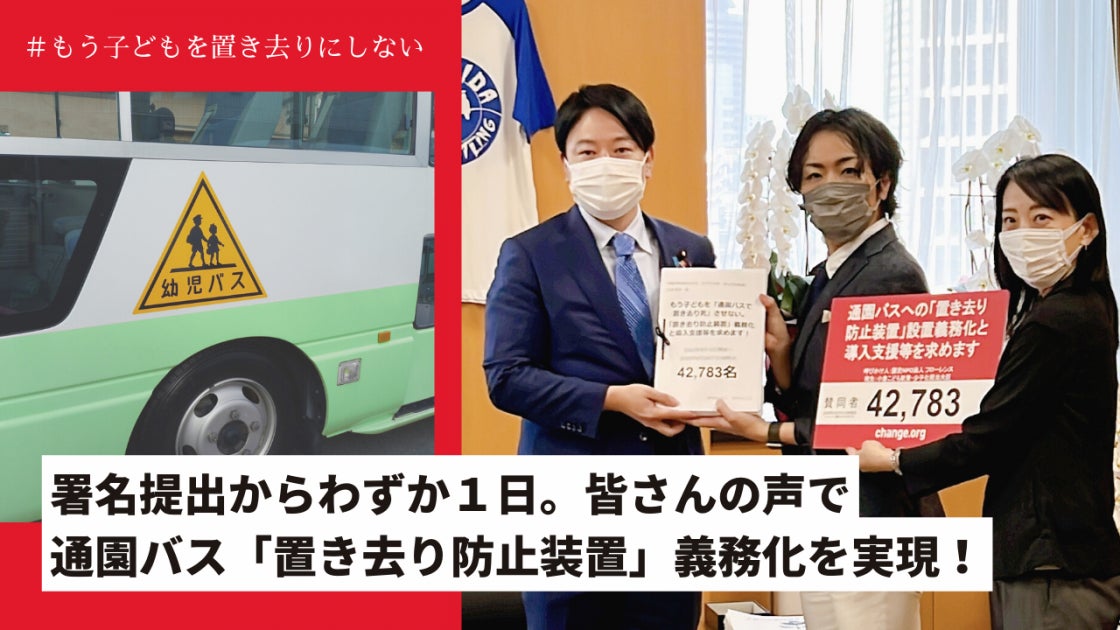 その後、署名を小倉子ども政策担当大臣に直接、署名をお渡し、そして10月12日に政府が2023年4月から全国の通園バスに、置き去りを防ぐための安全装置の設置を義務づける方針をまとめ、10月17日、事業者の負担が実質的にゼロになる財政措置を講じることが明らかになりました。
