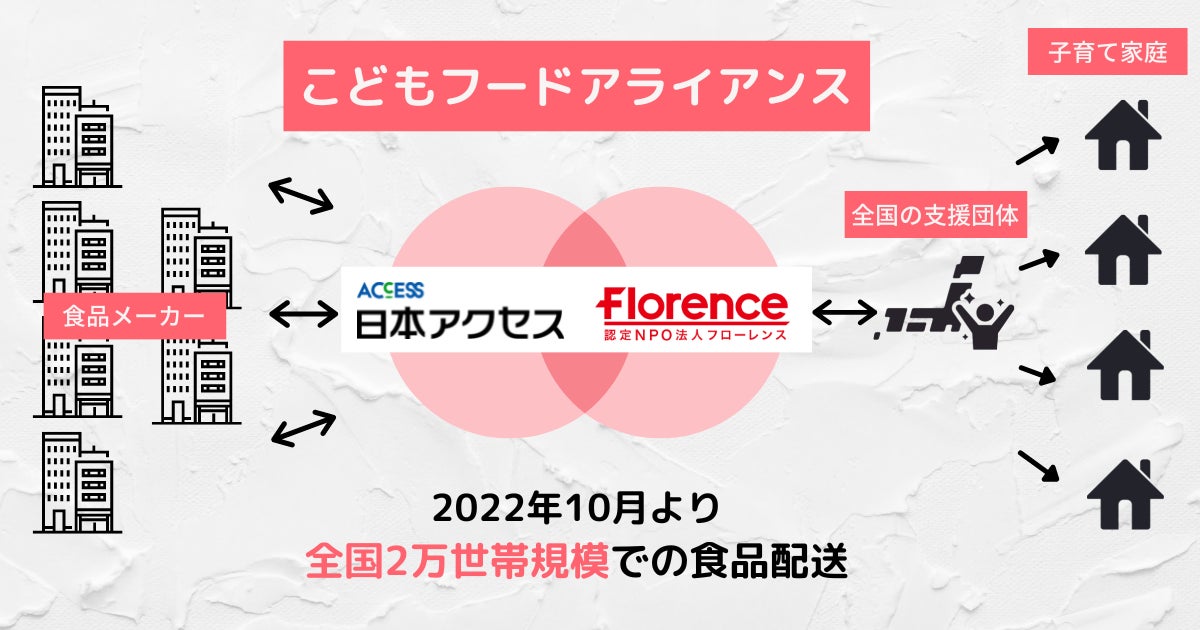 フローレンスでは、株式会社日本アクセスとともに、大手食品メーカー各社の協賛のもと、全国の子育て支援団体を通じて子育て家庭へ食支援を行う取り組み「こどもフードアライアンス」をスタートしています。