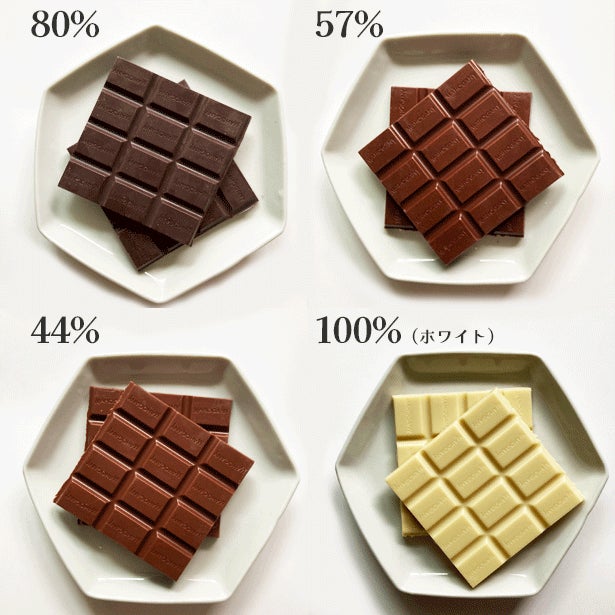 ホワイトチョコレート、44%ミルクチョコレート、57%ダークミルクチョコレート、80%ダークエクストラチョコレートの全種4枚セット (計4枚)