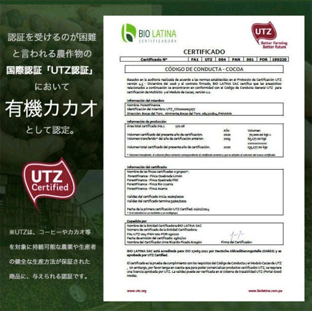 持続可能な農業、生産者の健全な生産方法が保証された商品に与えられる「UTZ認証」。獲得が困難と言るUTZ認証ですが、”マホガニーチョコレート in Panama”は「UTZ認証」の認定を受けています。