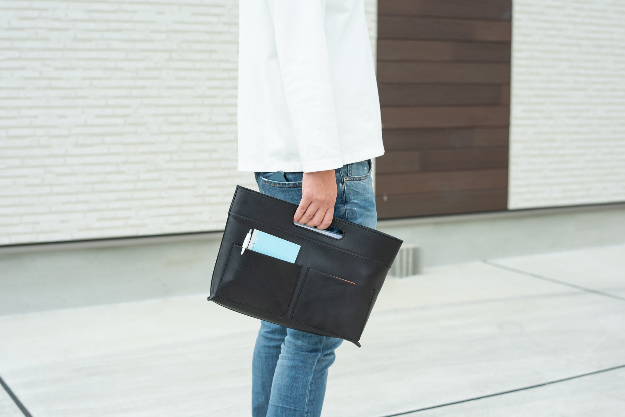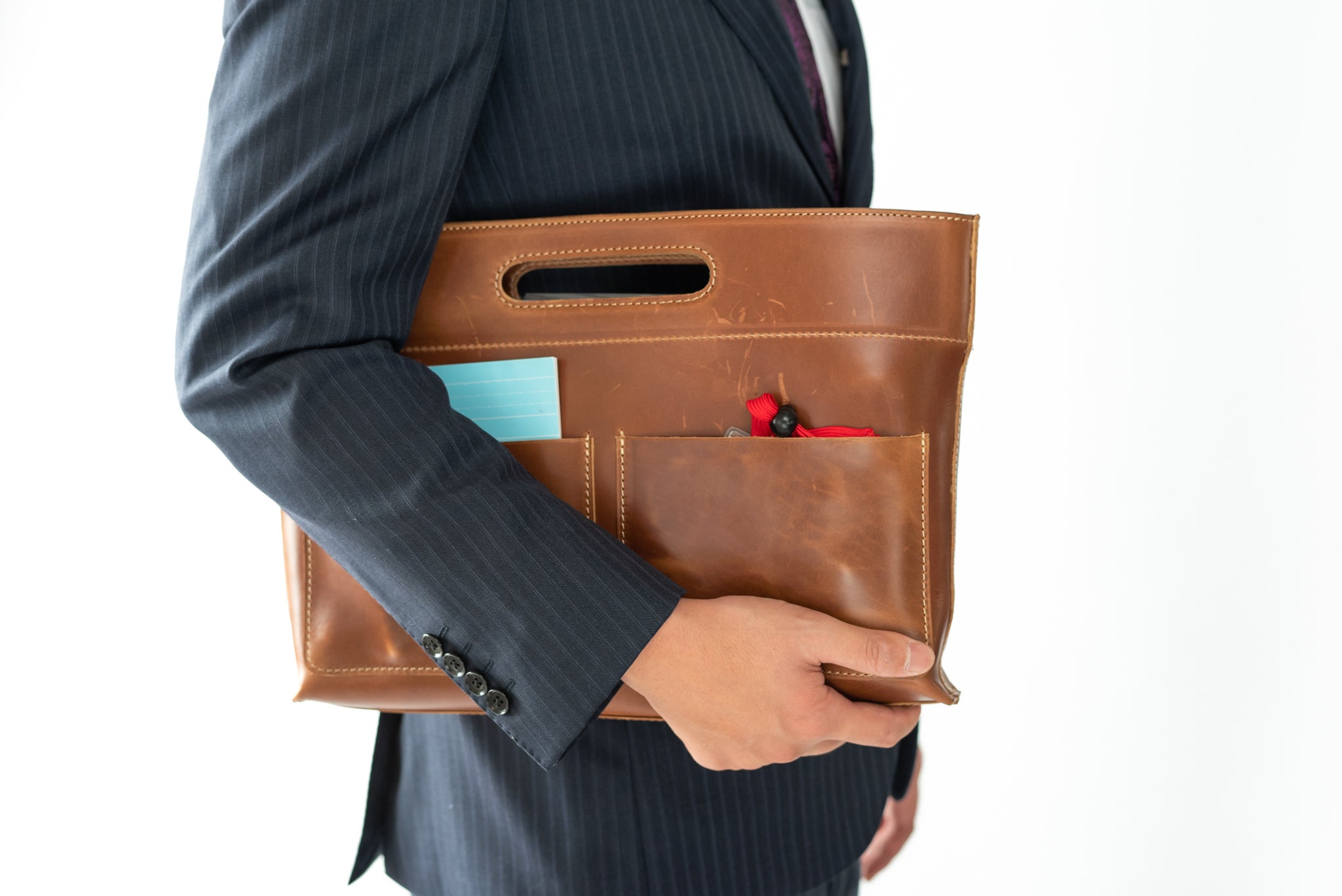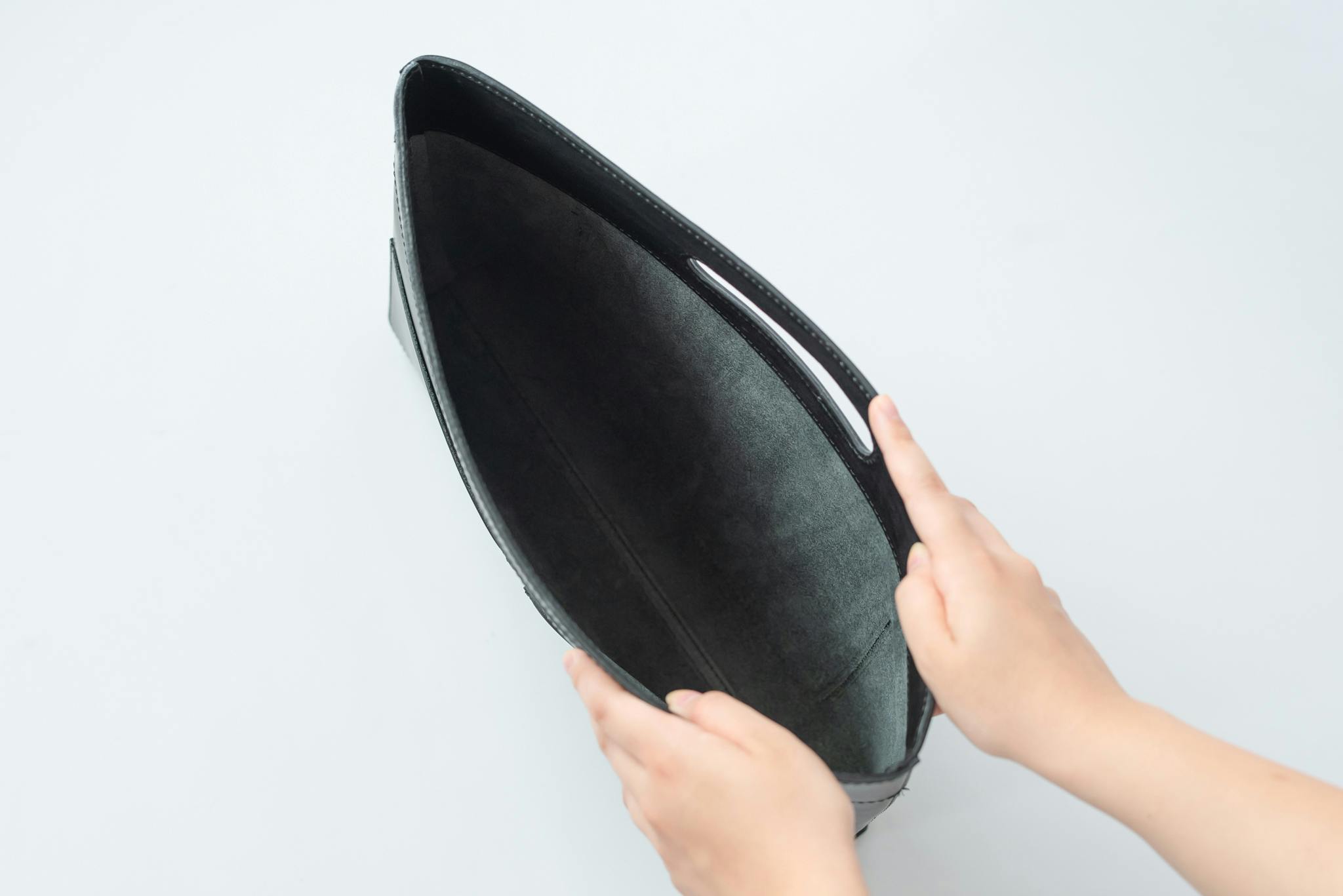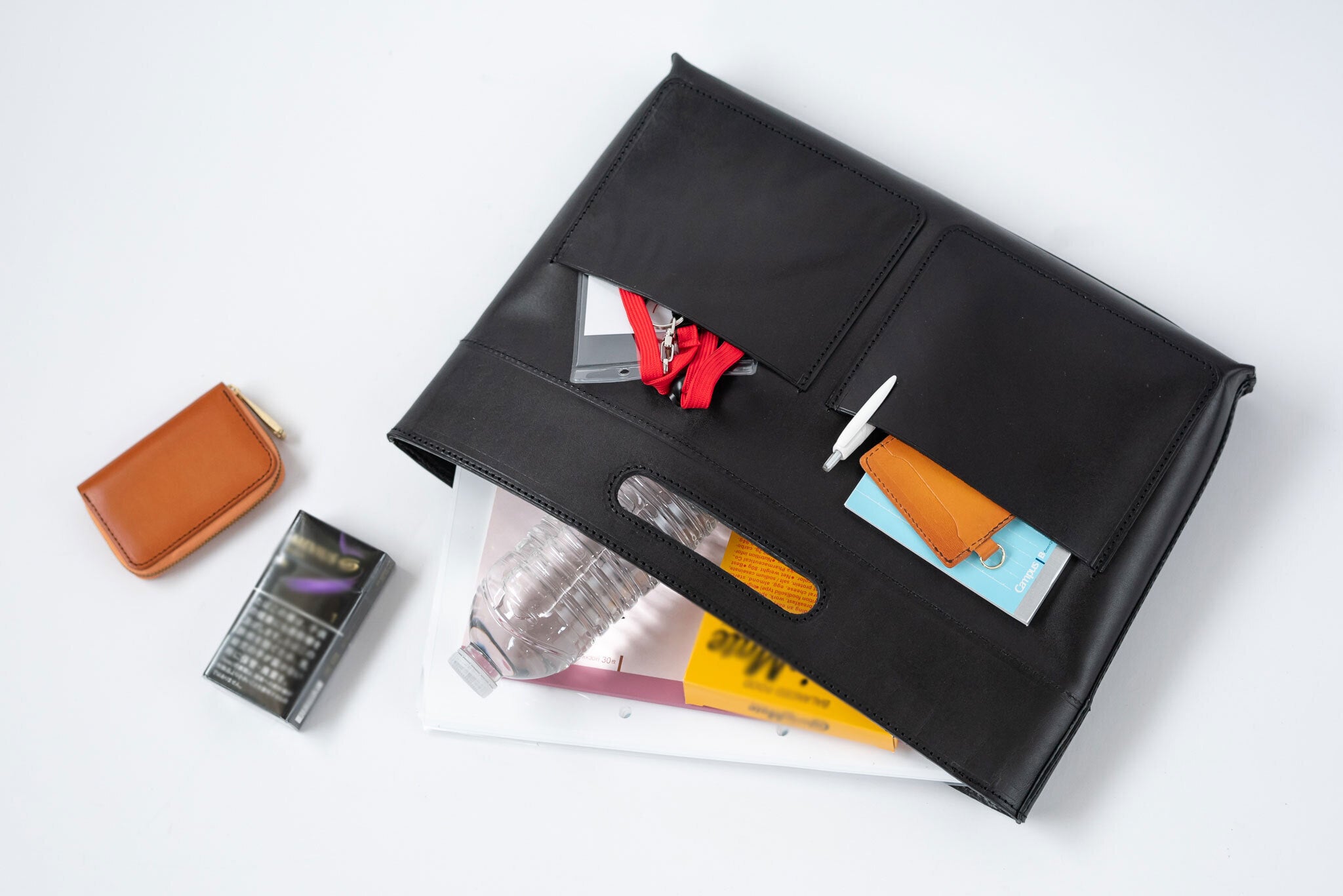 あれやこれやと専門ポケット(ペン差しポケットやスマホポケットなど)を作ろうとも考えたのですが、そうするとデザインがどうしても微妙になってしまい「出して見せたくなる」というコンセプトから大きく外れてしまいます。