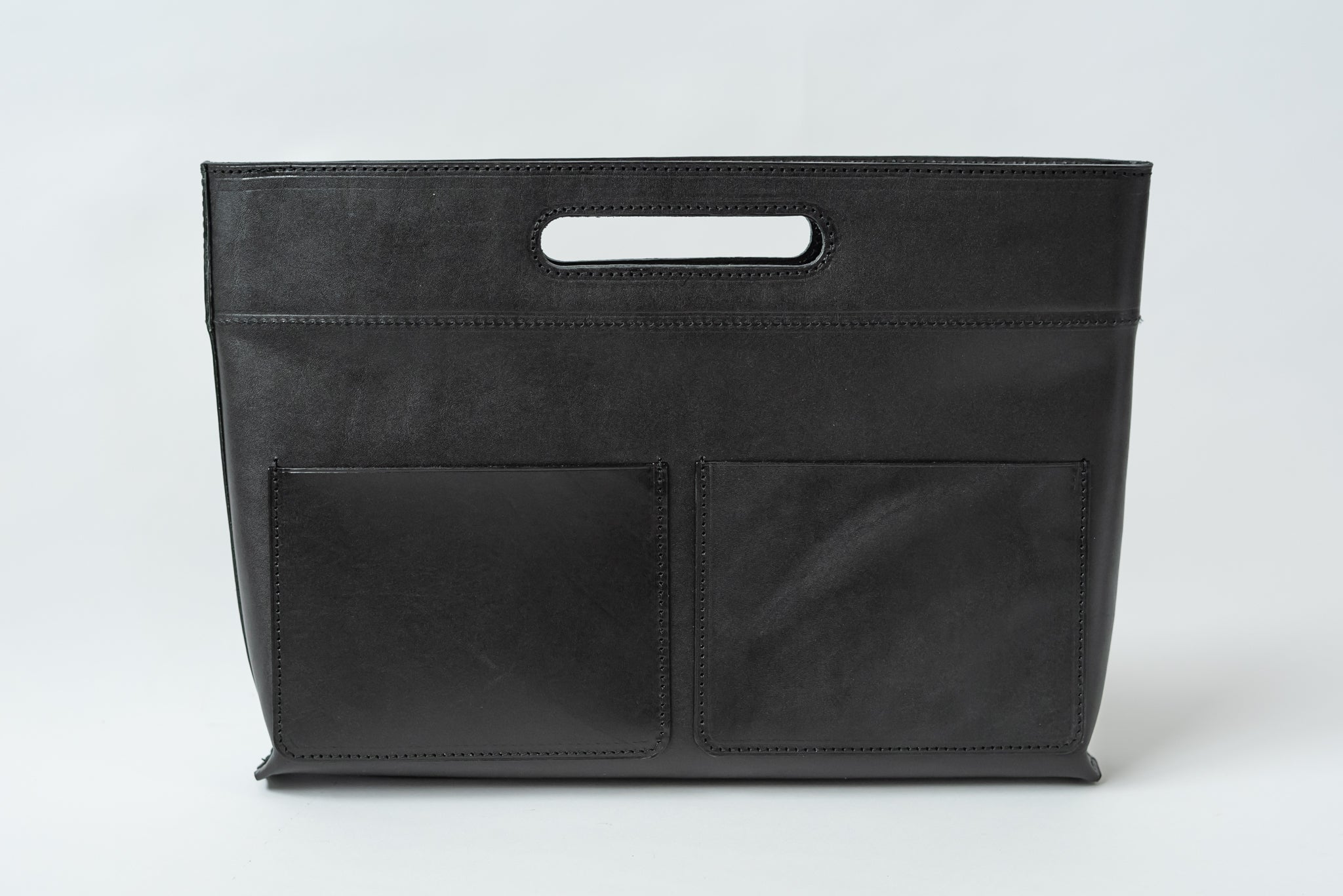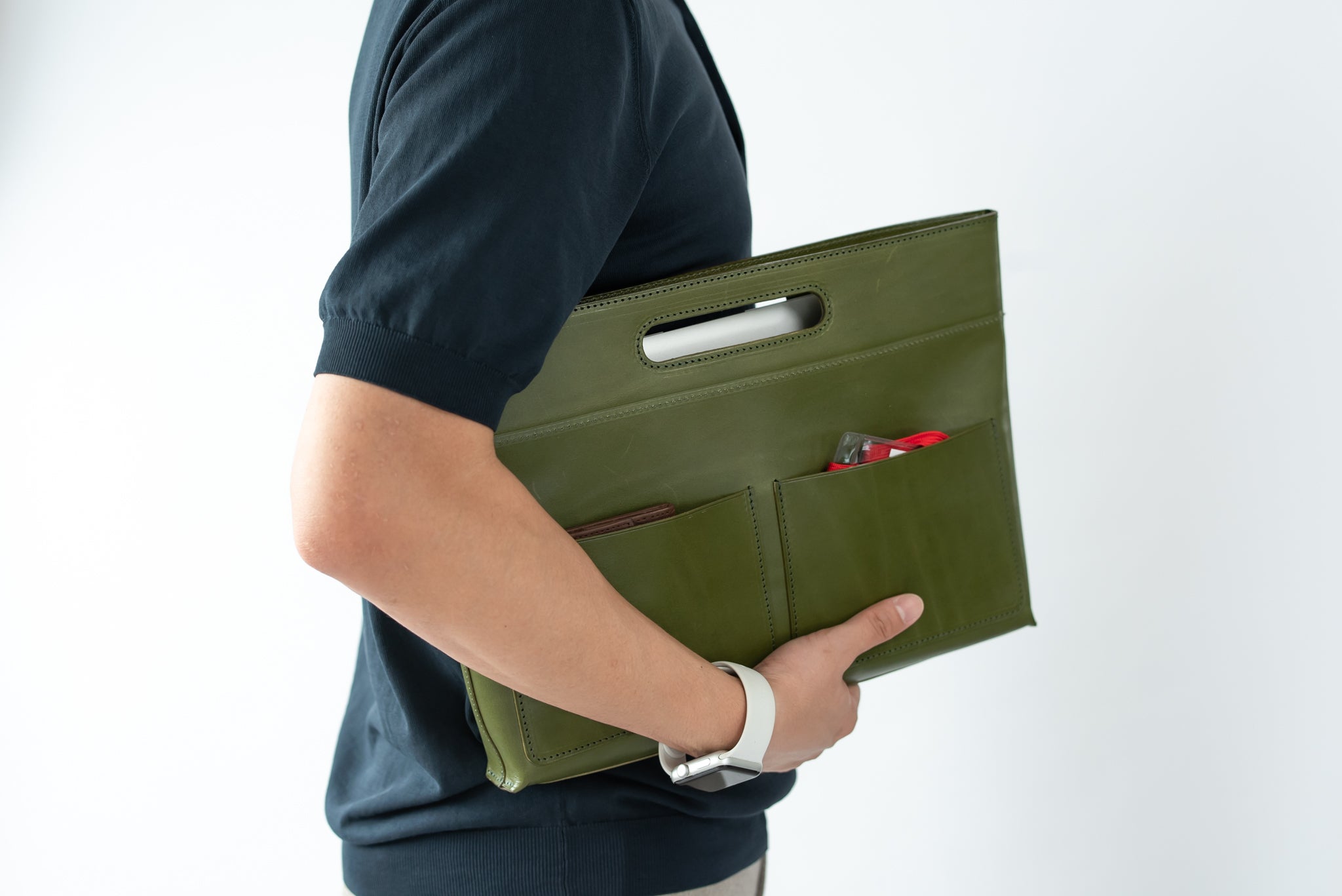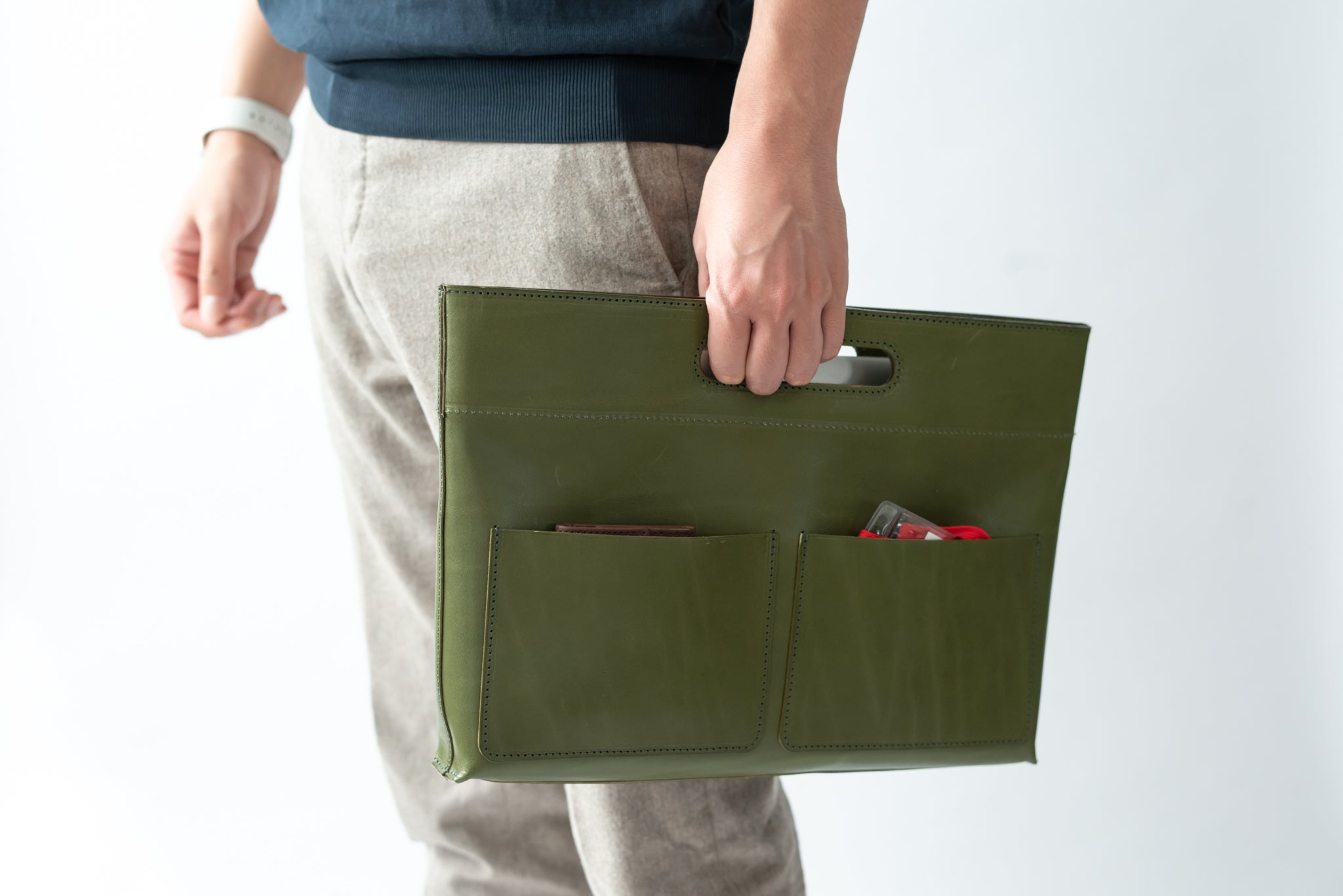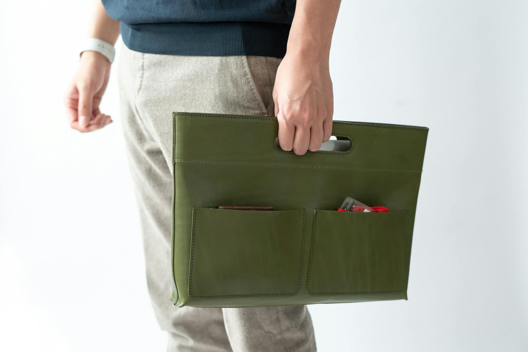 あれやこれやと専門ポケット(ペン差しポケットやスマホポケットなど)を作ろうとも考えたのですが、そうするとデザインがどうしても微妙になってしまい「出して見せたくなる」というコンセプトから大きく外れてしまいます。