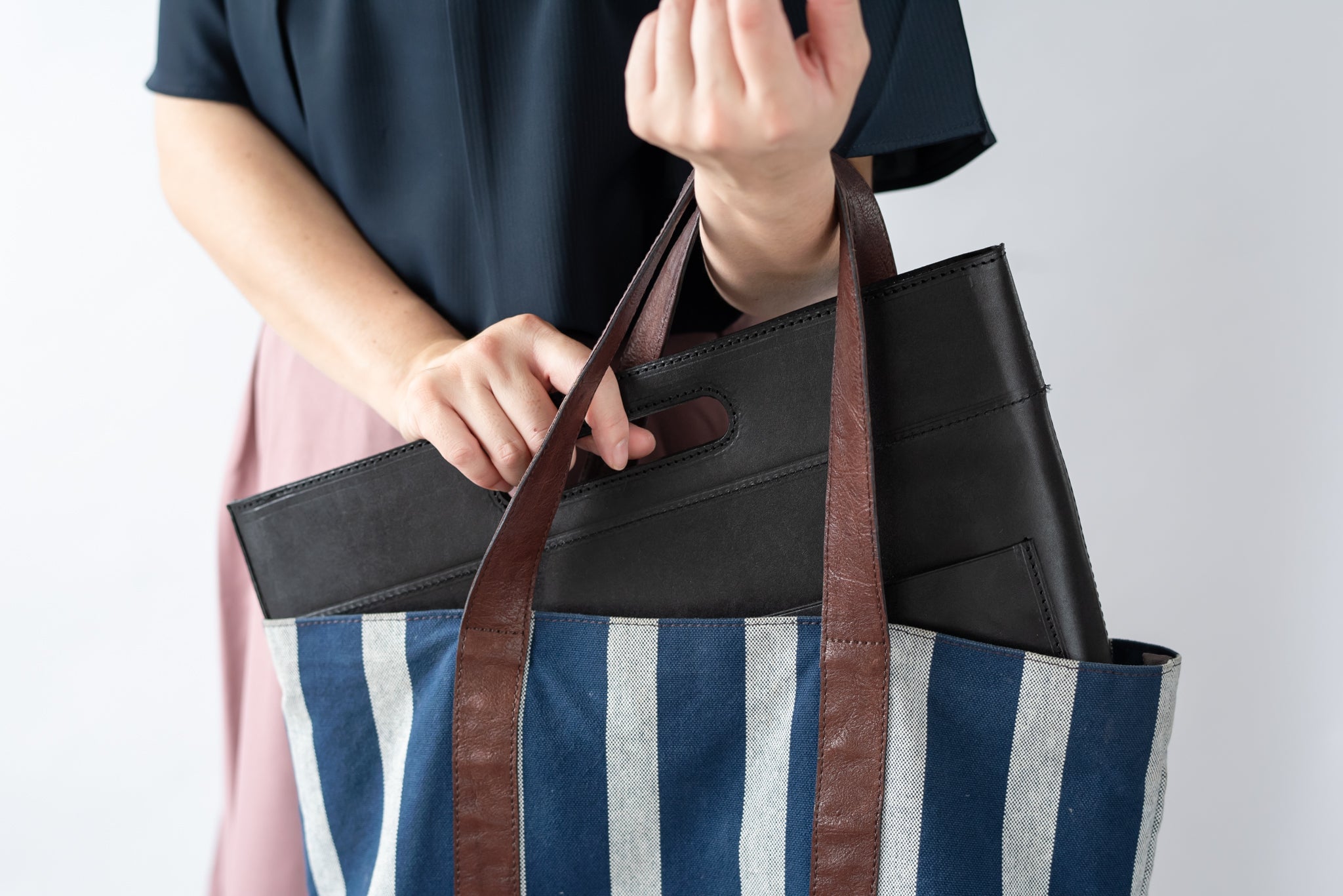 「バッグから出したくなるバッグインバッグ」はビジネスカジュアルにマッチするようにデザイン設計しました。