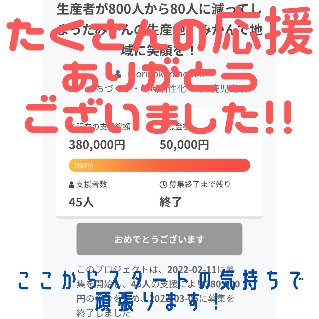 いつも温かく見守っていただき、ありがとうございます。残り1日となりました。最近では地元の方からのご支援があり、感動しています(T_T)媒体での告知等はしていないので、ネットでこの活動を知ってくださった方だと思います。地元の方からのご支援は本当に嬉しいです!!地元の店舗に、私の商品が置いてあるのは2店舗のみなので、私の名前すらご存じない方が多いのではないかと思います。それでもこの活動をネットニュースやInstagramを観ていただいけたのかなぁと想像を膨らませているところです。本当にありがとうございます(*- -)(*_ _)ペコリ耕作放棄地の再生プロジェクトは苗木の到着を待っているところなので、今は剪定作業と葉面散布による特製栄養ドリンクを樹に撒いているところです。剪定作業は全体に日があたるように剪定する枝を見極めますが、剪定をしていると、少し大げさかもしれませんが、自分自身と重ねてしまいます。今まで人生の岐路が大なり小なりあったはず。例えば・・・☆周りの葉っぱに光を当てるために枝を切る。→→周りの人のために自分の時間を使ったこと。何故そこまでする?と思ってもその時間があったからこそ気付けることがあり、結局は自分の糧になる。☆伸びた方向が周りの邪魔になる。→→過った方向に進もうとしたとき、いつも誰かが正しい道に導いてくれている。☆この枝は今年実がなるが、切る(みかんは2年目の枝に実がつきます。)→→商談会でマッチングがうまくいかなくても、決して間違っていない。たまたま、他を選んだだけ。(選ばれただけ)ノコギリやハサミを入れるのも樹に対してケガをさせるのと一緒。だから刃の入れ方にも気をつけます。何故なら、ちょっと間違えたらそこから枯れて、菌が入り込み、全体的に弱ってしまうから。(弱った樹のみかんはとても美味しいんですが、それは子孫を残すため。臨む結果ではありません。)正しい切り方が出来ると、食物ホルモンのおかげで、樹自身で治癒していきます。剪定も2年後の収穫を考えながらなので、雑にすることはできません。1つ1つ丁寧に作業し、美味しく実った私のみかんを食べてくれる方は、きっと丁寧な時間の使い方、生き方をされている方だろうなと想像しています。すみません。長々と話してしまいましたが、残り1日と数時間となりました!NEXT GOAL50人と掲げていますのでぜひ、お力添えいただけると嬉しいです!!お願いしかできないところが申し訳ないのですが(汗)引き続き皆様のご支援・ご賛同・情報の拡散をお願い致します。(*- -)(*_ _)ペコリ【キャンプファイヤー】https://camp-fire.jp/projects/view/525339【Facebook応援ページ】https://www.facebook.com/groups/583649602921456