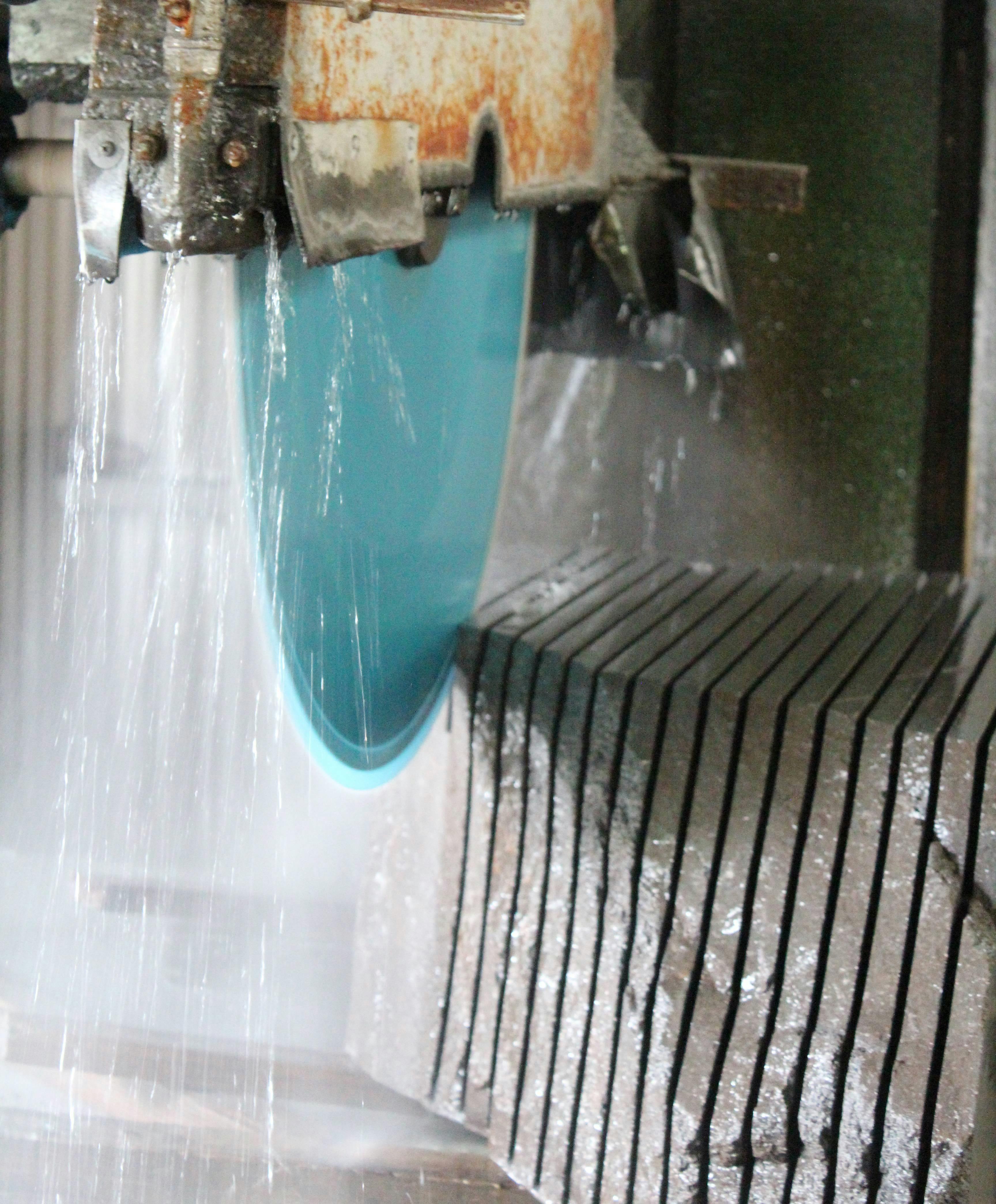 大きな溶岩石をカットするのには、なんと半日以上を要します。人工ダイヤモンドが埋め込まれたワイヤーを使い、少しずつ少しずつカットしていきます。ここから2次、3次とカット工程は続き、ようやく1m程度の溶岩「プレート」へと姿を変えていきます。