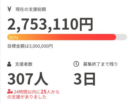 残り3日となりました。おかげさまで、支援者数が300名を超え、目標達成まであと少しのところまで来ました。