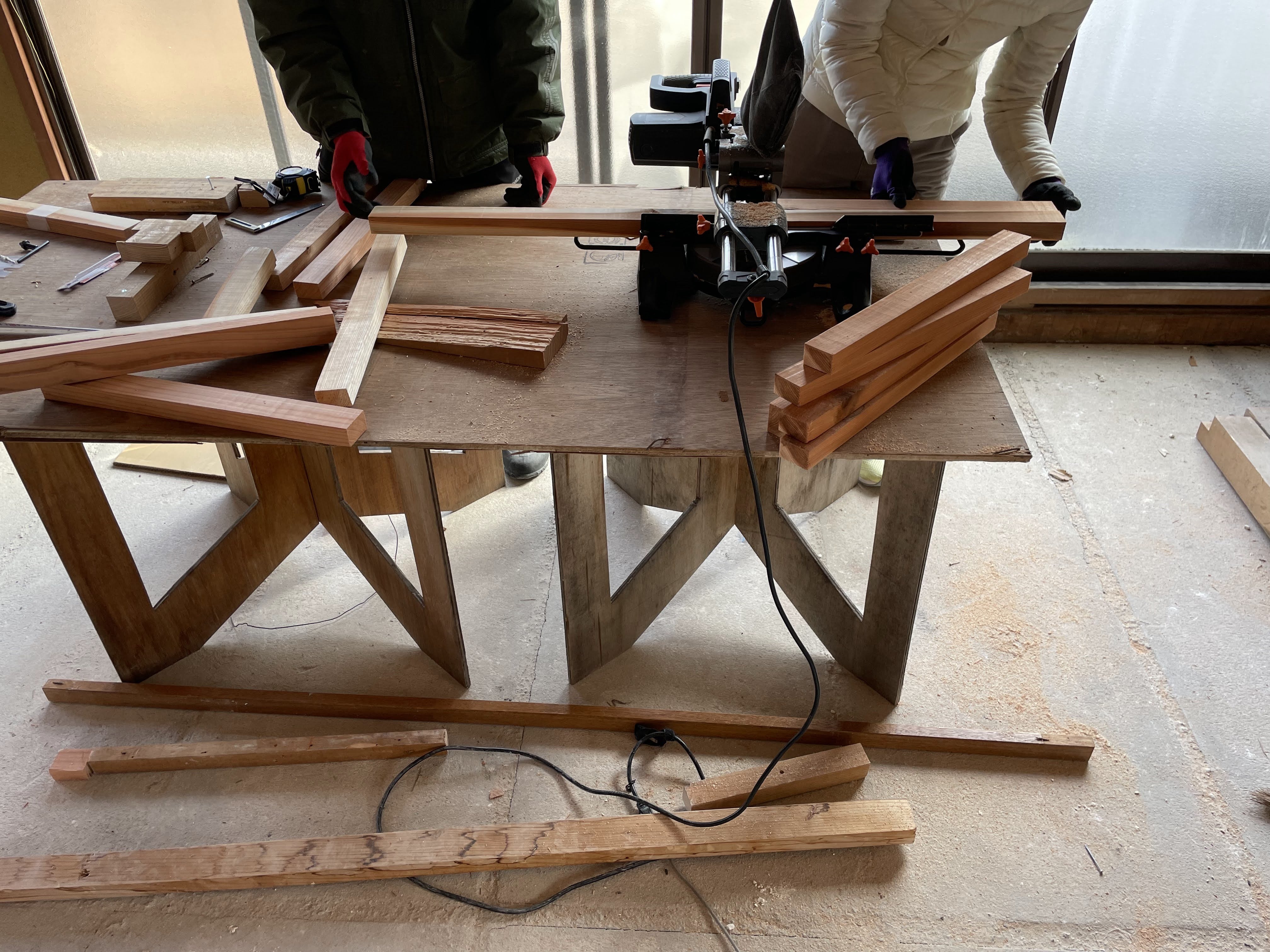 スライド丸鋸の使い方を教えて木材を切ってもらったり