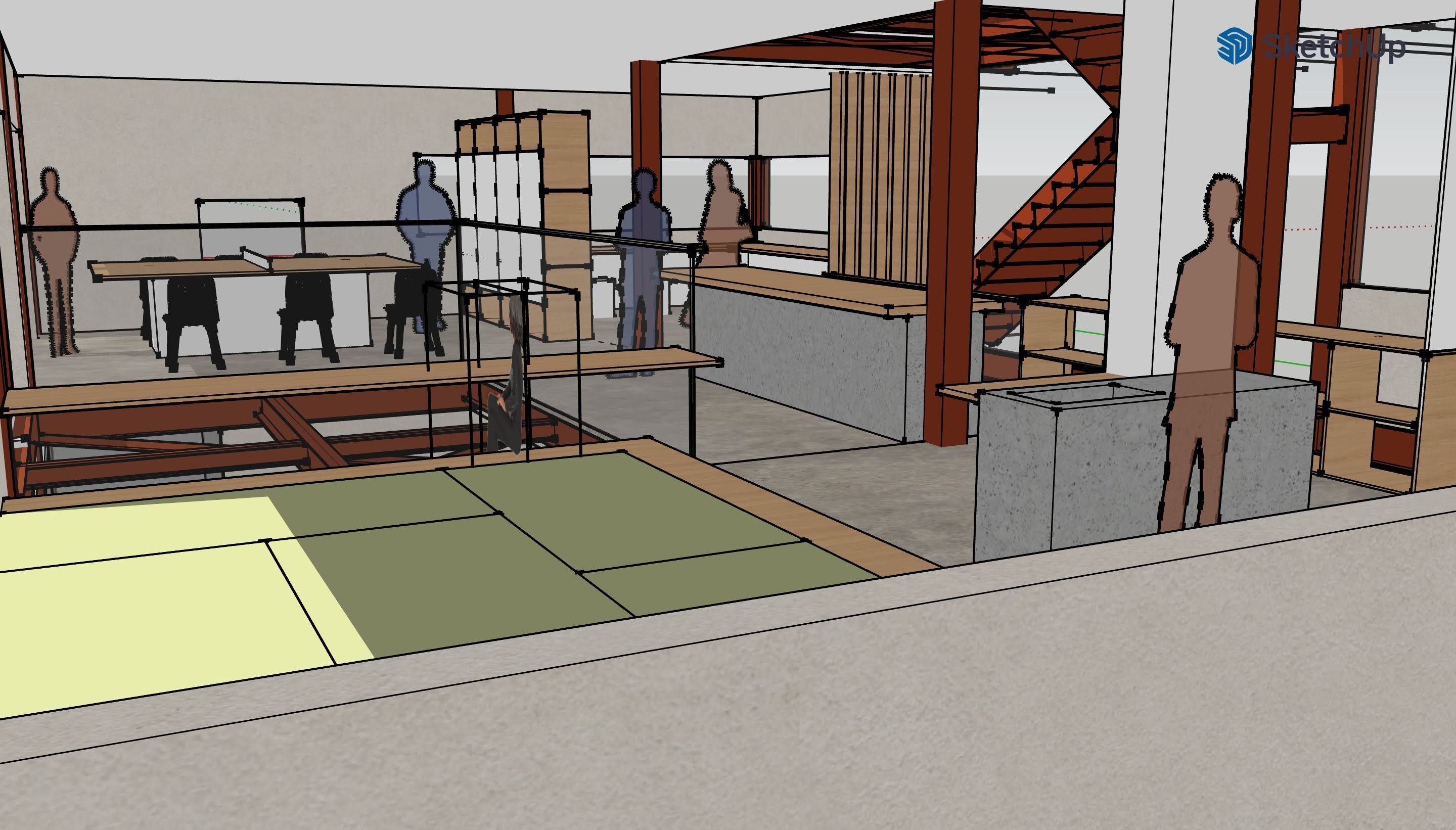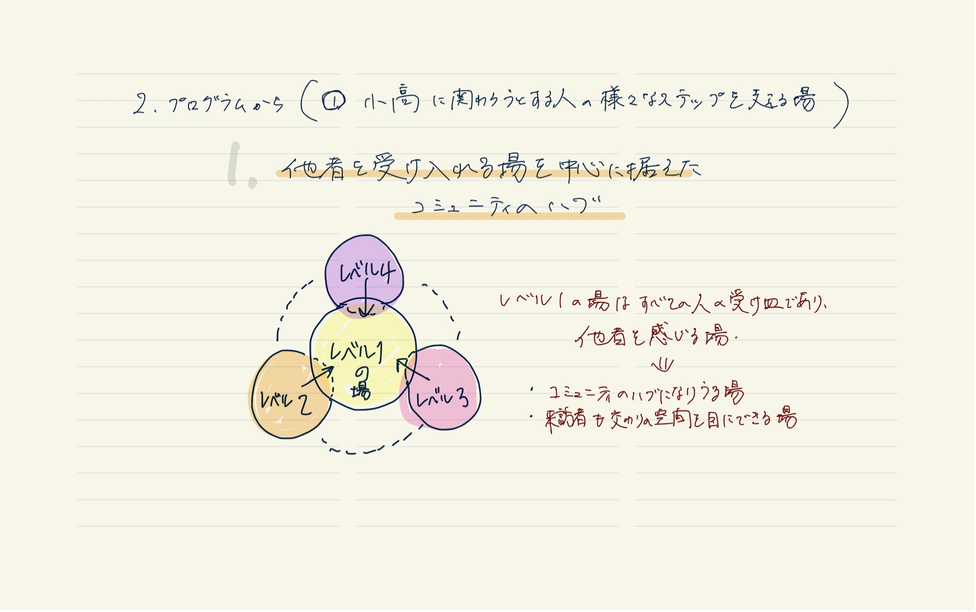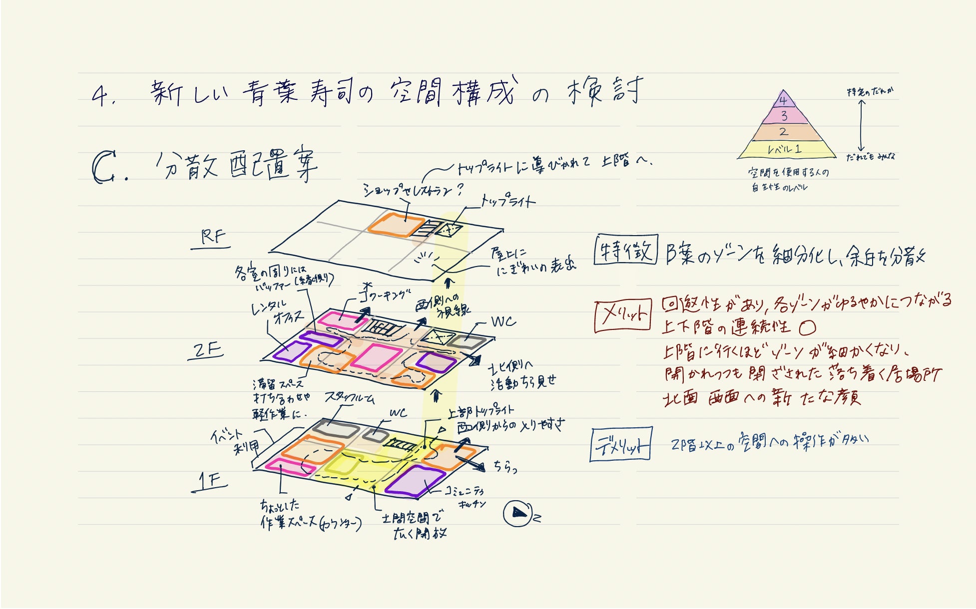 その上で、空間構成として、当初案のように部屋で区切られたもの、住民とコワーキングスペースの利用者の利用空間が完全に分断されたものより、ゆるやかにつながっていけるようなイメージが良いだろうという提案をしてくれています。