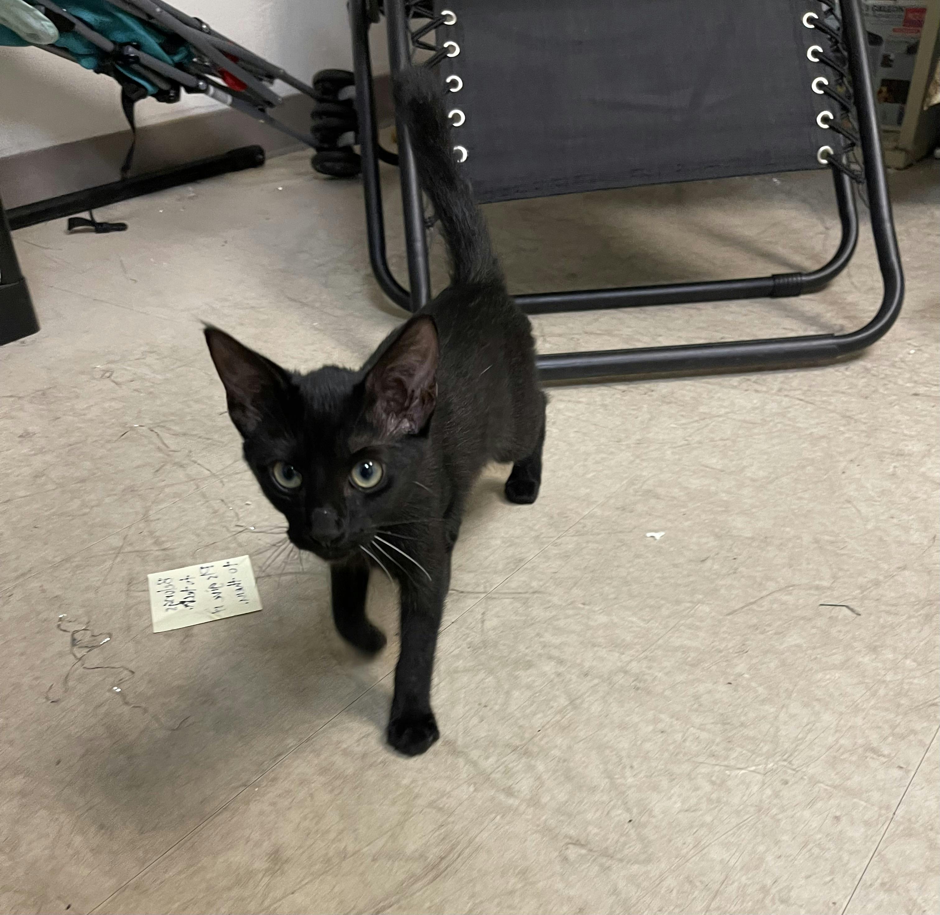 先週モールのセキュリティの男性から私に電話がかかってきました。〝モールの中に黒い子猫が首輪をロープをつけてフェンスにつながれて泣いていたので、保護しました。動物団体に連絡しても引き取りに来てくれないと言うしたどうしたらいいかと。とても人懐っこい子なので誰かが捨てていったんだと思います。”との内容です