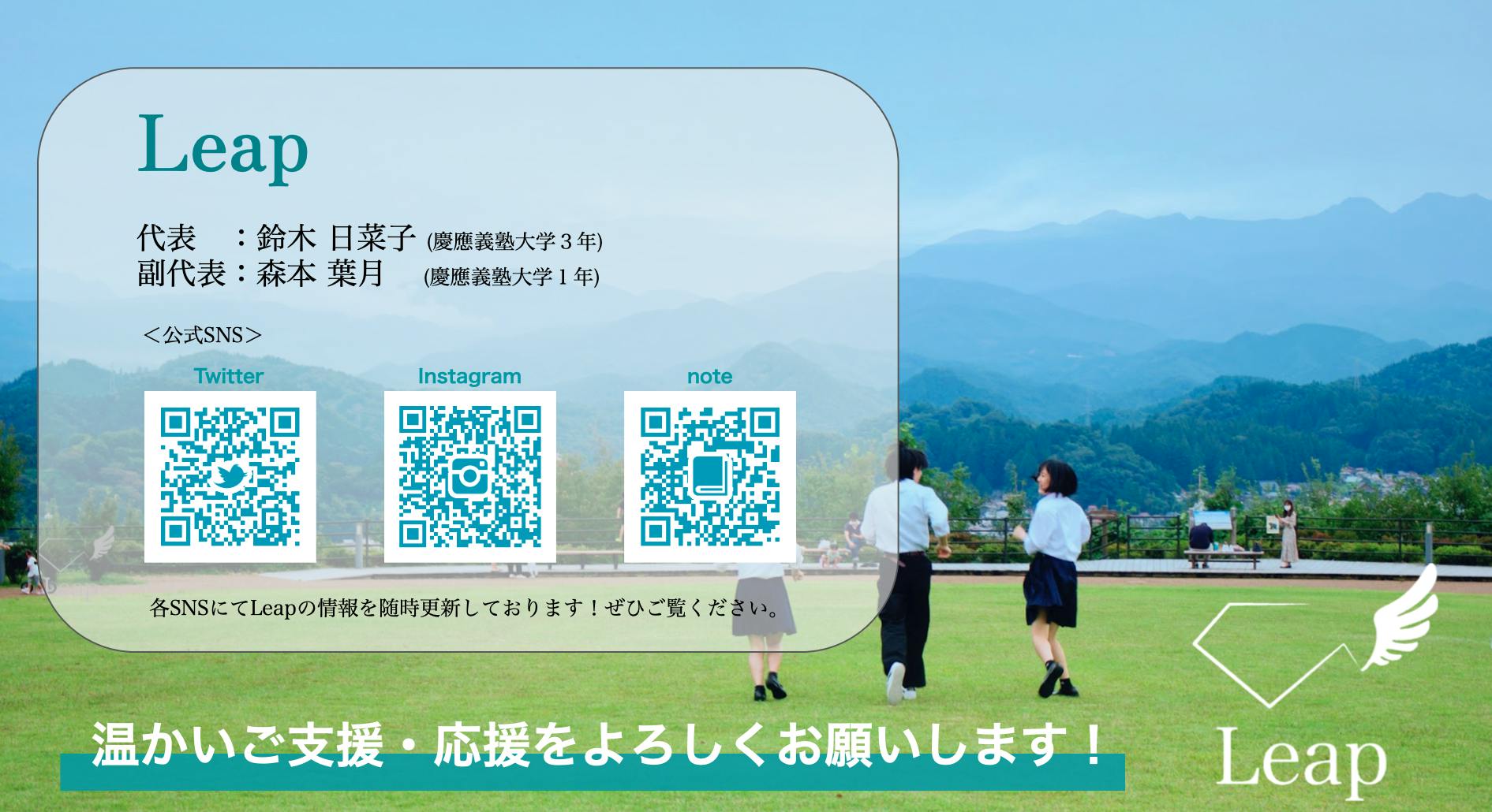 2022/01/22 18:00みなさん、こんにちは!クラウドファンディング終了まで【残り9日】となりました!!!とうとうカウントダウンスタートです!!残り9日、ぜひ応援や拡散などのご協力をよろしくお願いします!前回に引き続き二人の設立者の想いを語っていこうと思います。設立者2人目はLeap副代表の森本葉月です♪ーーーーーーーーーーーーーーーーーーーーーーーーーーーーーーーー本日は私、森本葉月の自己紹介、そして私自身のLeapへの想いとこれからの活動についてを綴っていきたいと思います!まずは私の自己紹介からさせていただきますね!私は現在、慶應義塾大学法学部政治学科に在学しており、(対面授業は少ないですが…)勉強やサークルといった大学生活を送りながら、Leapの副代表をしています。代表の鈴木と同じ、岐阜県高山市出身です。“どうして私がLeapの創設と運営に携わり、飛騨を離れた今でも、地元の高校生と向き合い続けるのか” については私の高校時代の経験が大きく関係しているので、私が高校生だった時の活動も少し紹介します!私は高校1年生の時に、飛騨の高校生が自ら地元について考え、創造する機会と環境を与える場として『ひだ!高校生会議』を発起しました。また、2年生の時には代表を務め、『ひだ!高校生会議』で出た高校生の案をもとに屋外イベントを企画、運営したことがあります。他にも、高校生同士で自分の活動をプレゼンする大会やワークショップなど、学校では経験できないような刺激を受けながら高校生活を送ってきました。このような活動を通して培った経験と学びから私なりの目標を持ち、今はLeapでの活動に取り組みながら、大学に通っています。(Leapの詳しい活動内容等はHPをご覧ください!:https://leap-zemi.amebaownd.com/pages/5009803/page_202106091622)私の紹介についてはこれくらいにして…次に私がLeapを立ち上げたいと思った動機や思いについて話そうと思います、、!なぜ地元や高校生に対して、力になりたいと思っているのか?なぜ大学生になってもそれらにこだわるのか?それは、私が高校生の時に経験した事やそこから得た学びが今の私にとって、とても大きな糧になっているからです。そして、このような経験と学びを私と同じように体験してもらいたいという想いがLeapを立ち上げる動機になりました。たった数年で飛騨では、高校生による学校外での活動が盛んになってきました。一方で、何かに挑戦したい気持ちはあるけど、実行に移すまでの過程あるいは挑戦する勇気がない、と諦めている高校生の存在を見かけたこともあります。このような「きっかけ」さえあれば花開くような若者たちが、貴重な経験と多くの学びを享受できるような環境をLeapは提供します。少し話はそれますが…Leapは”飛躍”という意味があります。これは、今はまだ目標を達成できてない、殻を破れていない高校生たちがLeapの提供する活動しやすい、挑戦しやすい環境を通して、なりたい自分になっていく、、、つまり”飛躍”していくという意味を込めました。私は、このような”飛躍”して活躍する高校生を支えていきたいです。もっと言うと、”飛躍”した高校生が飛騨で自然に見られる未来を望んでいます。これが私にとっての現段階のビジョンであり、Leapが目指すところでもあります。長くなってしまいましたが、私の紹介とLeap立ち上げの思いは以上になります!地元を離れたからこそ愛着が湧き、Leapの活動も相まって、飛騨と向き合うことが増えました。企業経営の基本やこれからの方針など試行錯誤の毎日ですが、Leap自体まだまだ達成できていないことが多い挑戦者です。少しずつ経営体制を安定させ、Leap…そして私自身も”飛躍”できるよう努めていきます!!!Leap 副代表森本 葉月 もっと見る
