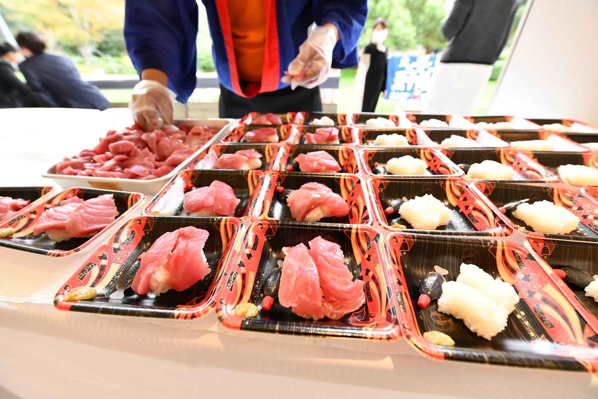 マグロ解体ショーでの”美味しい”の要素は、マグロ解体ショー終了後に捌きたてのお振舞い寿司が食べれる時です。皆様本当に笑顔で召し上がられ、私共もイベント成功を感じる瞬間です。