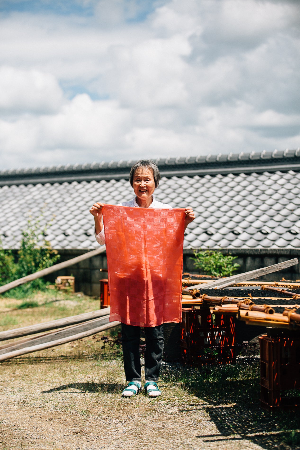 燻蒸中は24時間、つきっきりで温度調節をするため、ひとときも気が抜けません。年に一度、烏梅を作る数週間はその年で一番気合の入る時期です。時間をかけて出来上がった烏梅は、紅花と掛け合わせることで、烏梅の酸と紅花の持つ色材が反応し、鮮やかな紅色の染料になります。これを「紅花染め(べにばなぞめ)」と呼びます。近年では、手に入りにくくなってしまった烏梅の代わりに、紅花とクエン酸を使用する染色家の方もいらっしゃいますが、発色の鮮やかさ、透明感は烏梅を使ったものとは大きな違いがあります。