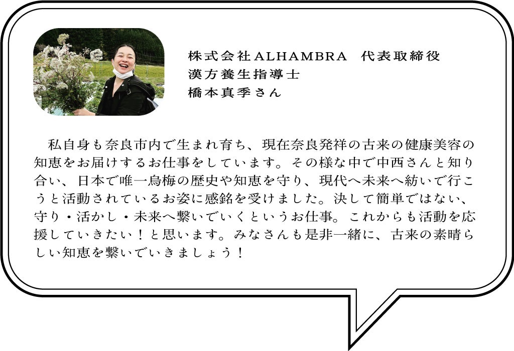 梅や烏梅の魅力を知ってもらう、それこそが「烏梅を後世に残す」ためにまずは必要なこと。このページを読んで興味を持っていただけたら、それこそに意味があると思っています。ぜひ我が家の自慢のすっぱい梅干しを食べて、烏梅や口紅に想いを馳せていただけましたら何よりの幸せです。