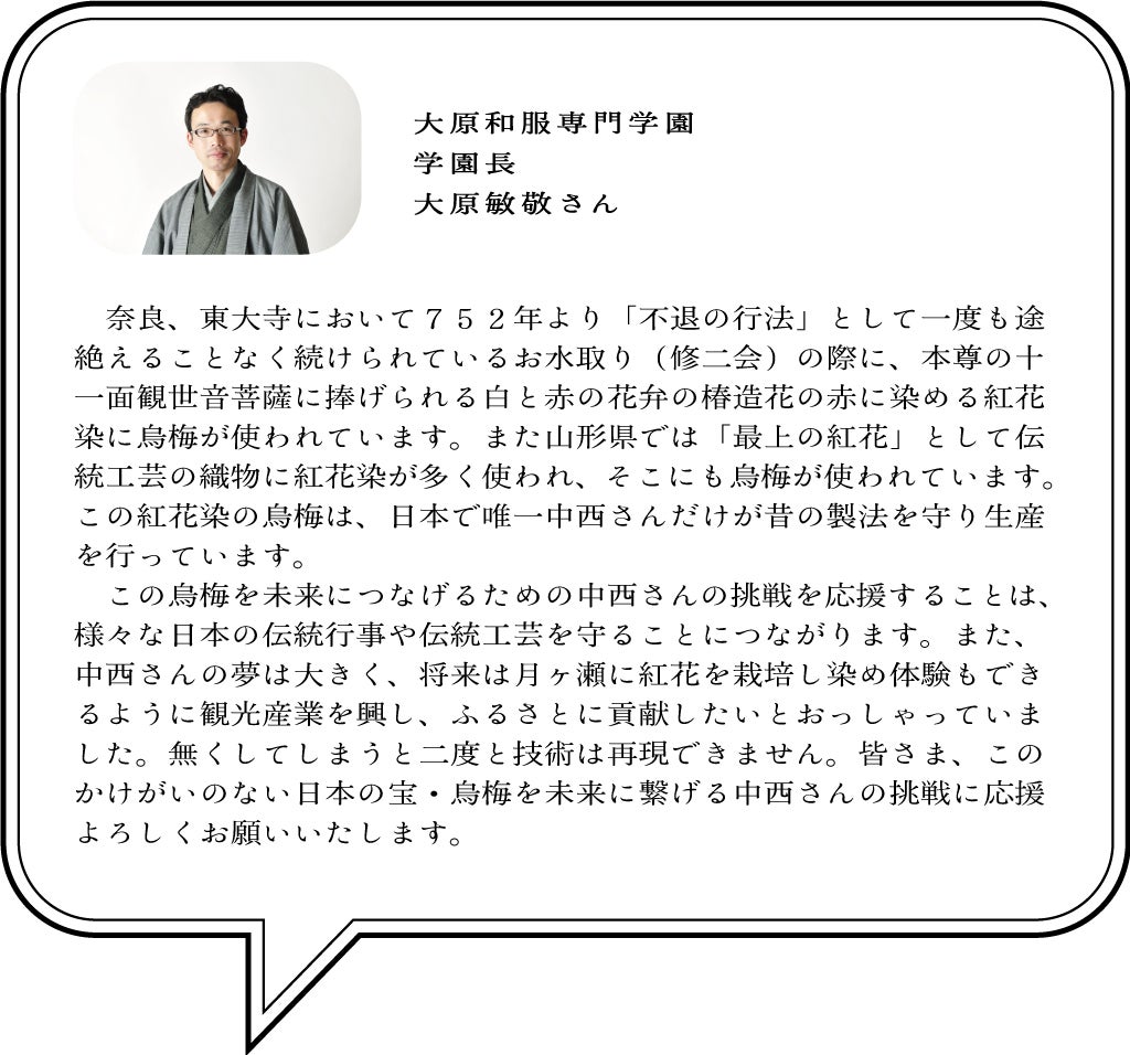 紅花と烏梅の口紅は当時から伝統工芸品として大切にされてきました。これまで先人たちの強い想いで守ってきた烏梅作りを後世に残すため、伝統と文化の継承のためにも紅花と烏梅だけを使ったオーガニックの口紅を復活させたいです!