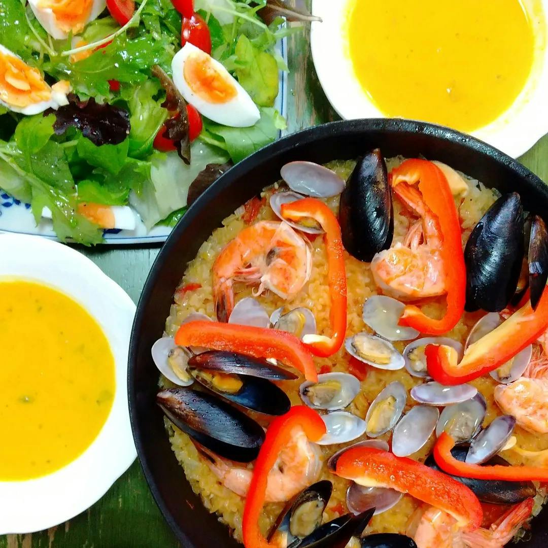 紅花の黄色色素サフロールイエローで色付けしたライスと魚介出汁のパエリア