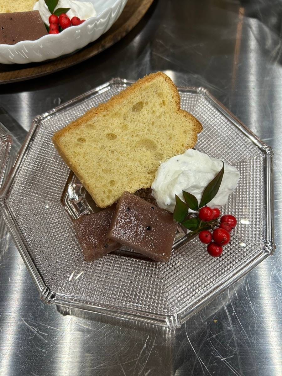今回の烏梅コース料理に合わせて、シフォンケーキや生クリームや羊羹に烏梅フレーバーを入れてもらいました。甘過ぎない風味はコースの締めに最適なデザートです。
