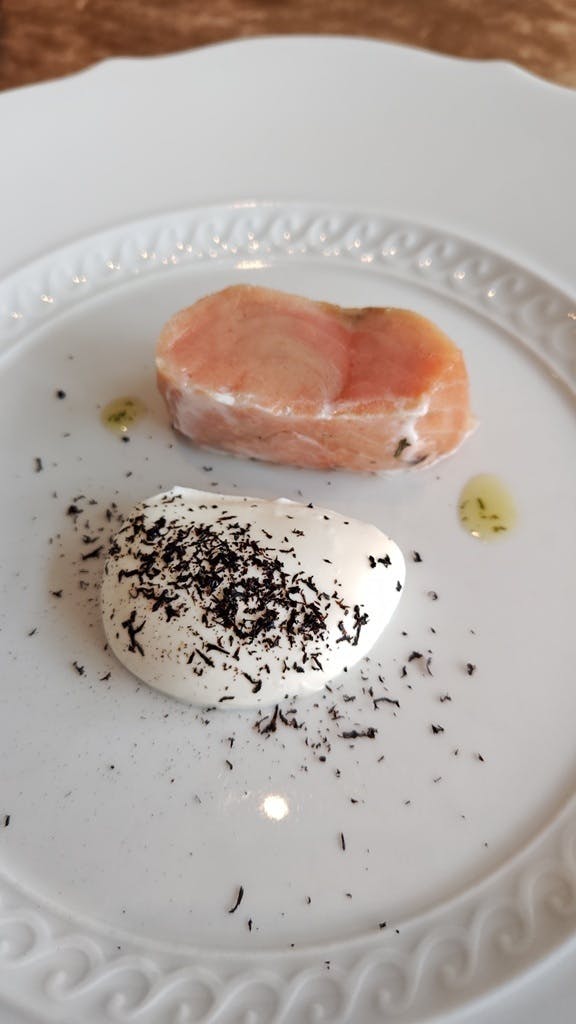 昨年訪れた村上市の塩引き鮭と烏梅がまさかのコラボ。コンフィの柔らかさ烏梅の香りとモノトーンの美しさ。