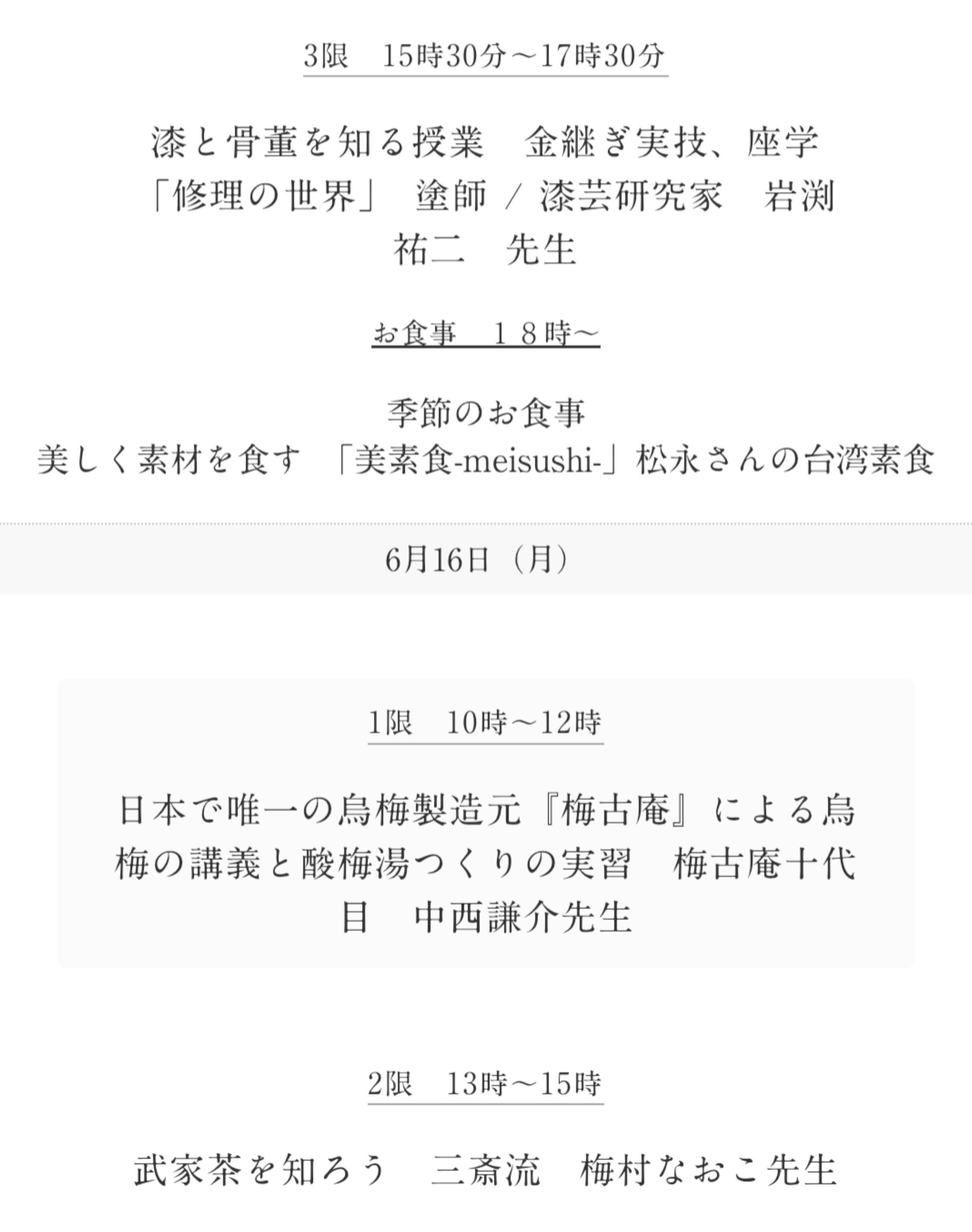 6月16日(月)大人の寺子屋余白にて烏梅講義と酸梅夢とおにぎりの実習を行います。沢山のご参加お待ちしています。場所滋賀県大津市三井寺町お申し込みは下記URLからお願いします。備考欄に講師中西の紹介と記載すると初回入会金は不要になります。https://mosh.jp/services/d5decff4c7be4b4abcd6b7376b8b0fe4@terakoyayohaku大人の寺子屋余白とは大人になってから今更聞けないことや、学んでおきたかったこと、祖父母や父母に話や教えを乞うておけばよかったと思うようになったら、大人になった証拠とも言えます。知らないということを知るまでに人は時間がかかるのです。 私達の中にはいつも、祖先が培ってきたものや風土が与えてくれるものが流れています。それは私たちを産み育てた、自分の一部だからです。自分を知り愛することは、人に愛されるよりずっと大切な事のように思えます。自分と折り合いをつけるために、自分を知る、自分らしさを探すために自分の土台を探すことは何をするにも役に立つように思われます。大人が幸せでなければ子供も幸せにならないという当たり前のことに気づき、大人とこれから大人になる人が自分やそれを取り巻く世界を理解するための入門編の講座です。道のつくものや日本の習い事は入門したら師が亡くなるまで辞めることは難しいという慣例が重くのしかかり一歩前に踏み出せない方、自分の国のことをもっと知りたいと思ってはいるが、どこから始めていいのか迷っている方、もしくは一通り日本文化を経験して、流派を超え、俯瞰でお茶とは何か、美術とは何か、宗教とは、生きるとは、という大きな問いに答えるきっかけになれば幸いです。それぞれの差を理解しつつ、共通の軸となるものはなにかを考えるように設計されています。天宗教と美術について学んでいきます。 人智を超えているもの、そしていこうとするものに対する勉強になります。 多種多様な美術と宗教という海に漕ぎ出します。地 食と環境についての学び。 自然と人間のことを学びます。 盆栽を学んだり、お味噌を作ったり、出汁や海洋資源を学ぶことによって環境問題や法規のあり方を考えます。人人が作るもの、私たちを動物から分化する永遠の遊び。 茶道、香道、工芸、骨董、茶室などの空間を学びます。 生きていく上でなくても生きていけるが、ないと寂しく感じるものについて考えます。#大人の寺子屋#余白#天地人#烏梅#酸梅湯#梅古庵