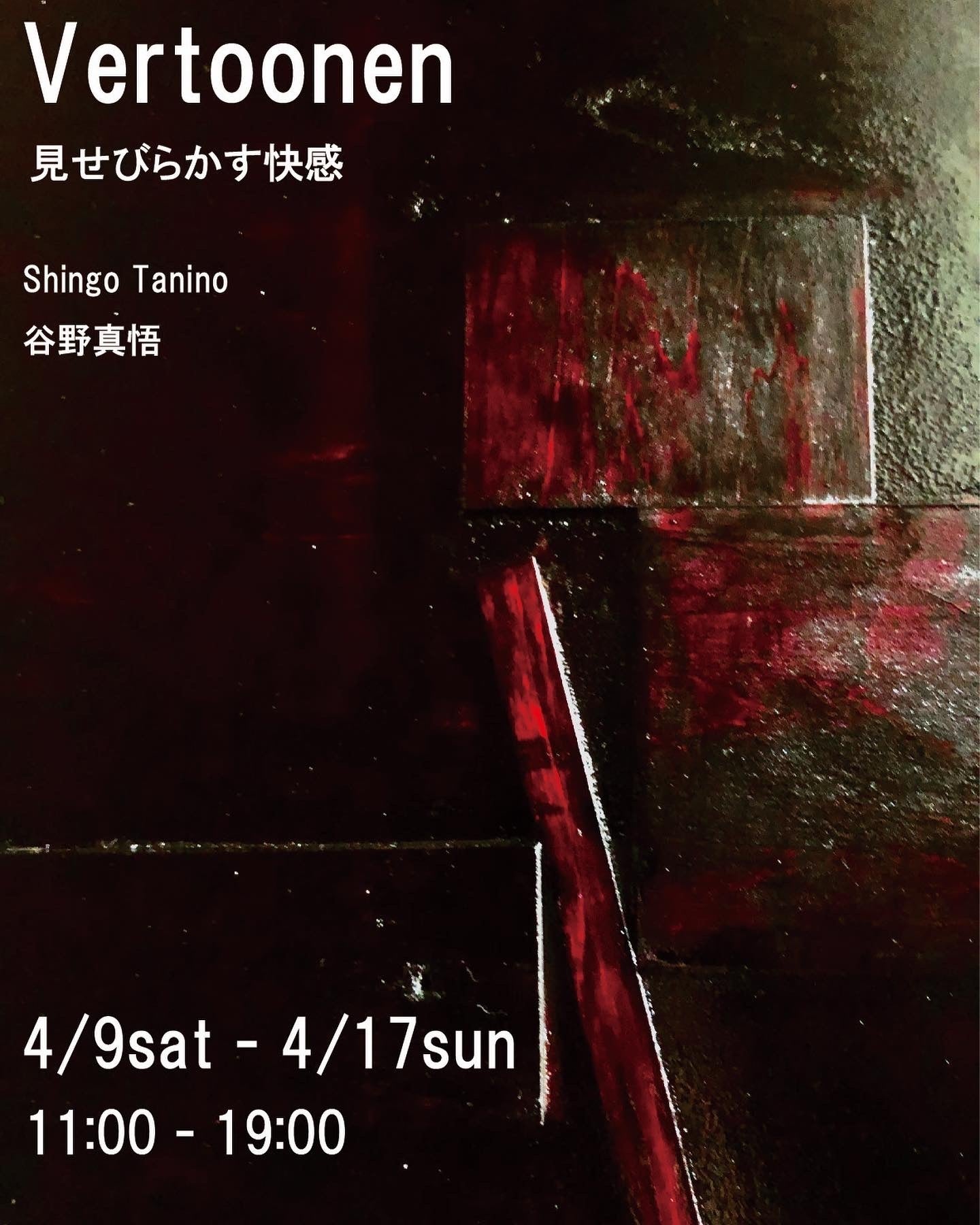 vertoonen -フエルトーネン-谷野真悟 個展4/9-1711:00-19:00ペインター谷野真悟による個展を新yugeにて行います。「見せる」「演じる」などの意味を持つタイトルを掲げインスタレーションでの作品展開をみせます。部屋という概念を油画で描いてきた作家である谷野は今回は空間演出作品での展示を試みます。部屋を構成する要素としてある家具や道具の物々、壁や床によって作られる間取り、それらの中で生活を行う我々の視点などを新たなアプローチで”再現“してゆきます。新yugeでの柿落としになる本展示、会場には作家在廊で開催しておりますので、是非皆様お越しください。Alternative Space yugehttps://goo.gl/maps/XNdN4wfUGDzVxT6M9こちらyugeの新しい位置情報になります。三条京阪駅から徒歩7分、東山駅から徒歩3分です。三条通りから古川町通りを登り「角屋マンション」と看板のある建物の左手の路地を入った先にあるゲートシャッター奥左手の建物になります。丸い「yuge」の看板を目印に路地奥を覗いていただけたら見つかるかと思います。移転先は路面ではないので最初は見つける際にご苦労をおかけするかもしれませんが、会場まで無事到着されることをhogeメンバー、作家ともども楽しみにしております。是非皆様ご来場くださいませ。企画:コニシムツキ