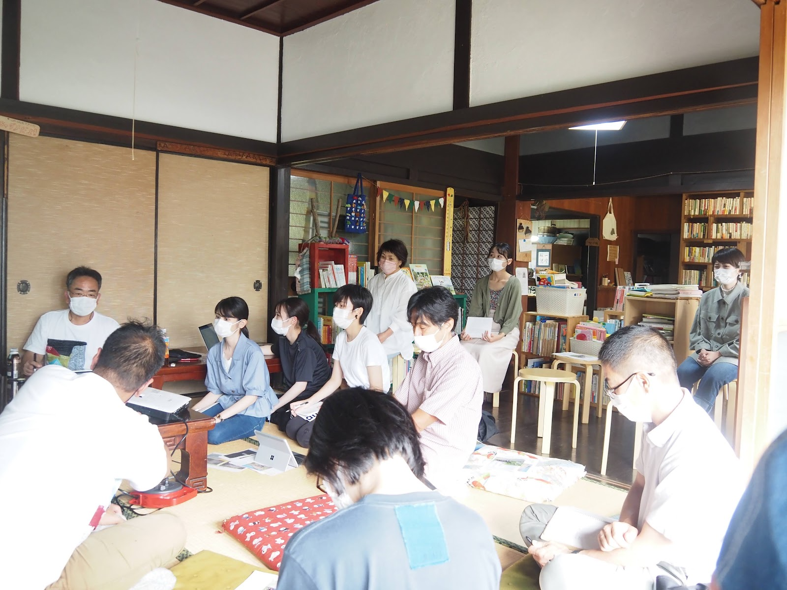 上の写真は、たくさんの想いがこもった本をバックに、茅葺き未来会議をを行なった時の様子です。