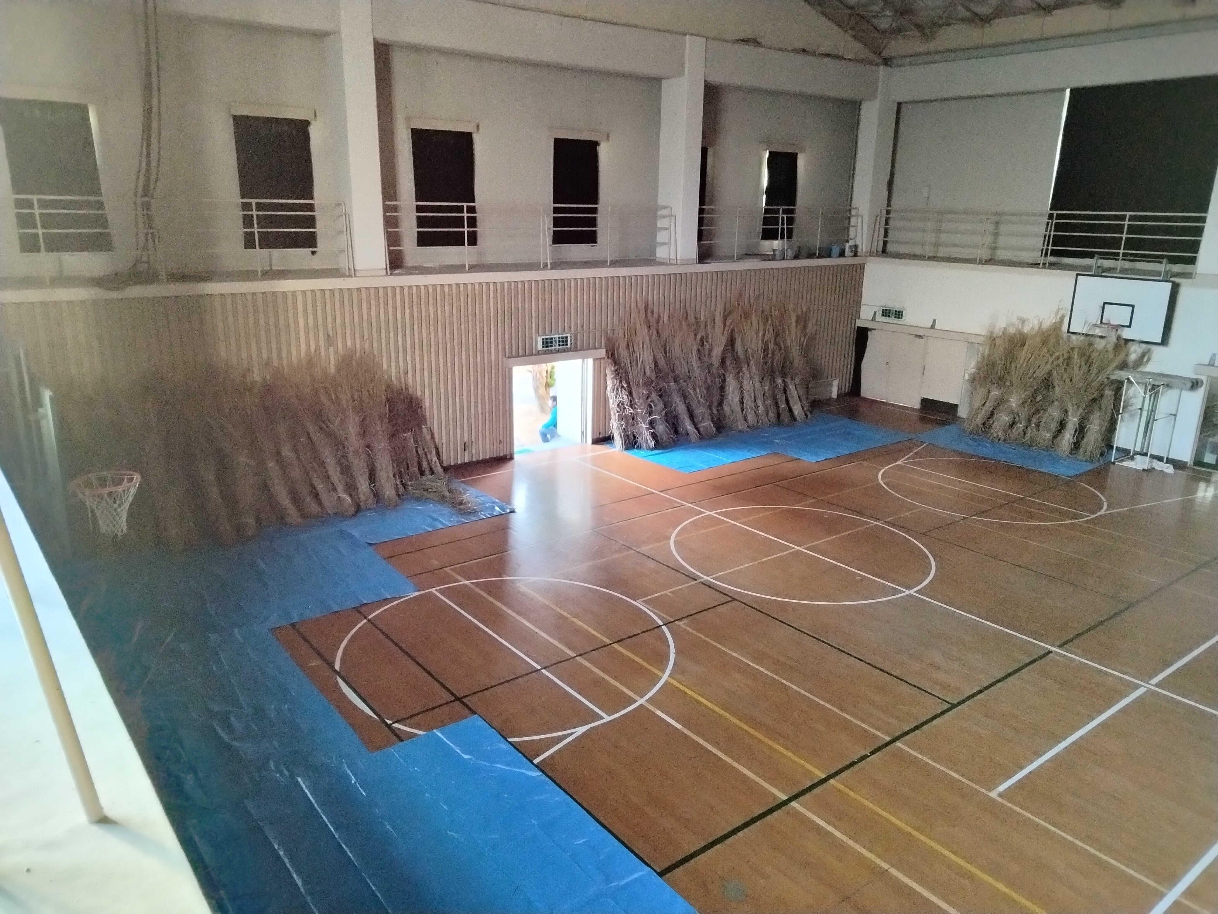 私たちの活動では、中国山地全体から茅を集めていきます。茅は半年ほど乾燥させる必要があり、旧小学校の体育館を使用させていただいています。茅刈りをした後に体育館に搬入し、保管しています。