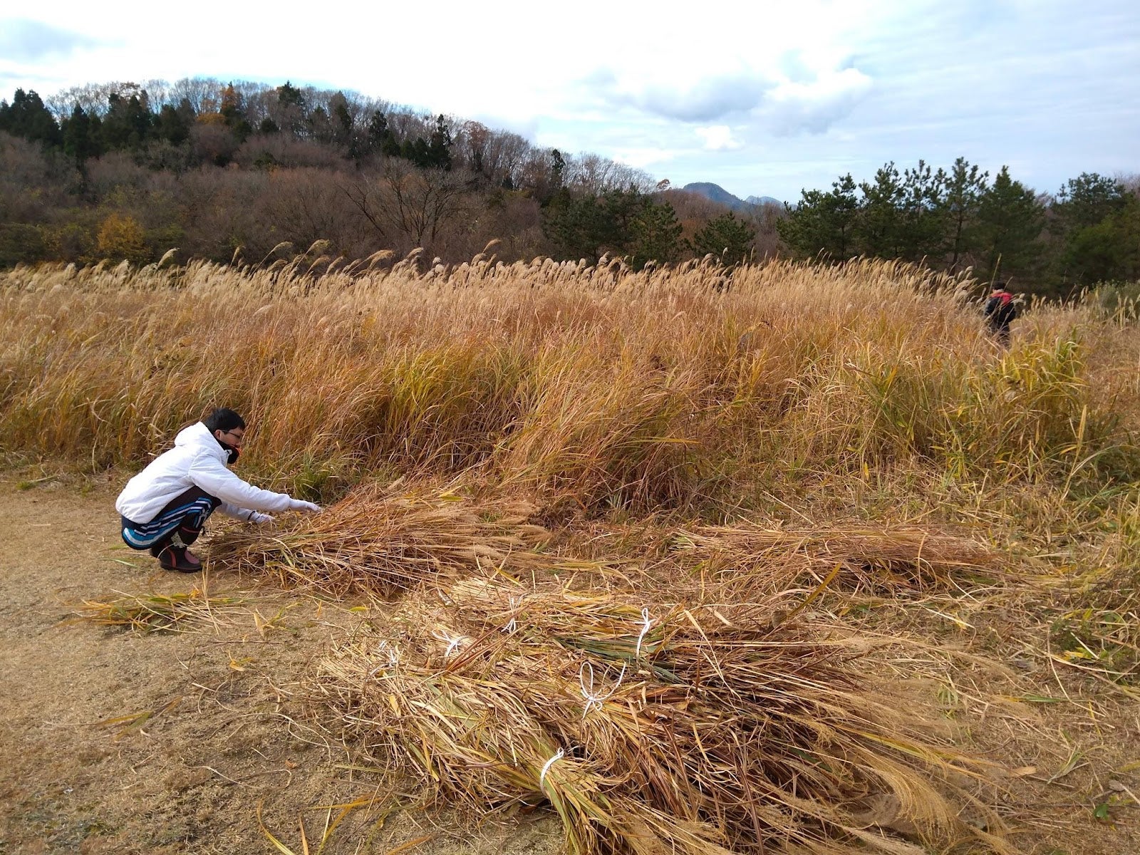 幸運にも、隣町に茅葺の職人さんがおられて、葺き替えの作業自体は行っていただけそうです。でも、肝心の茅がありません。昔は少しずつでも集めれていた茅 (ススキ) も、最近は農地利用が進み、生活スタイルも変わったことで、ススキを見かけることも少なくなりました。私たちが活動する志和堀地区でも近畿大学・市川尚紀先生らと一緒に茅刈りなどを行っていますが、2軒の茅葺民家の葺き替えを行うほどの茅を集めることはできていません。昔の “結” を背景とした関係性の中で集まっていた茅も、現代社会の中で集めようとすると簡単なことではありません。