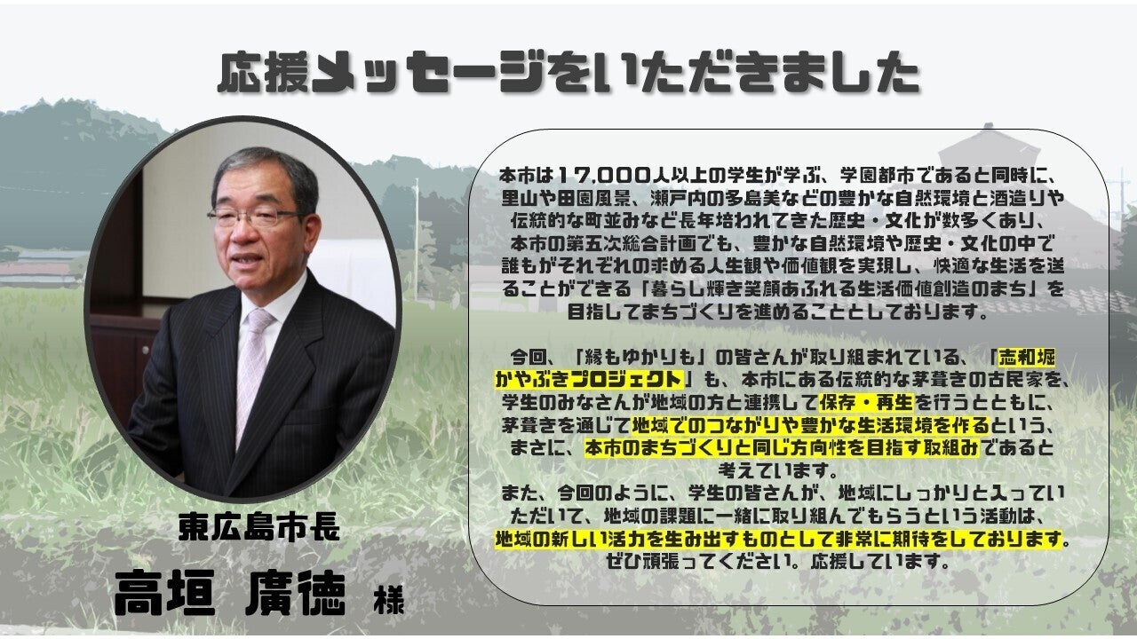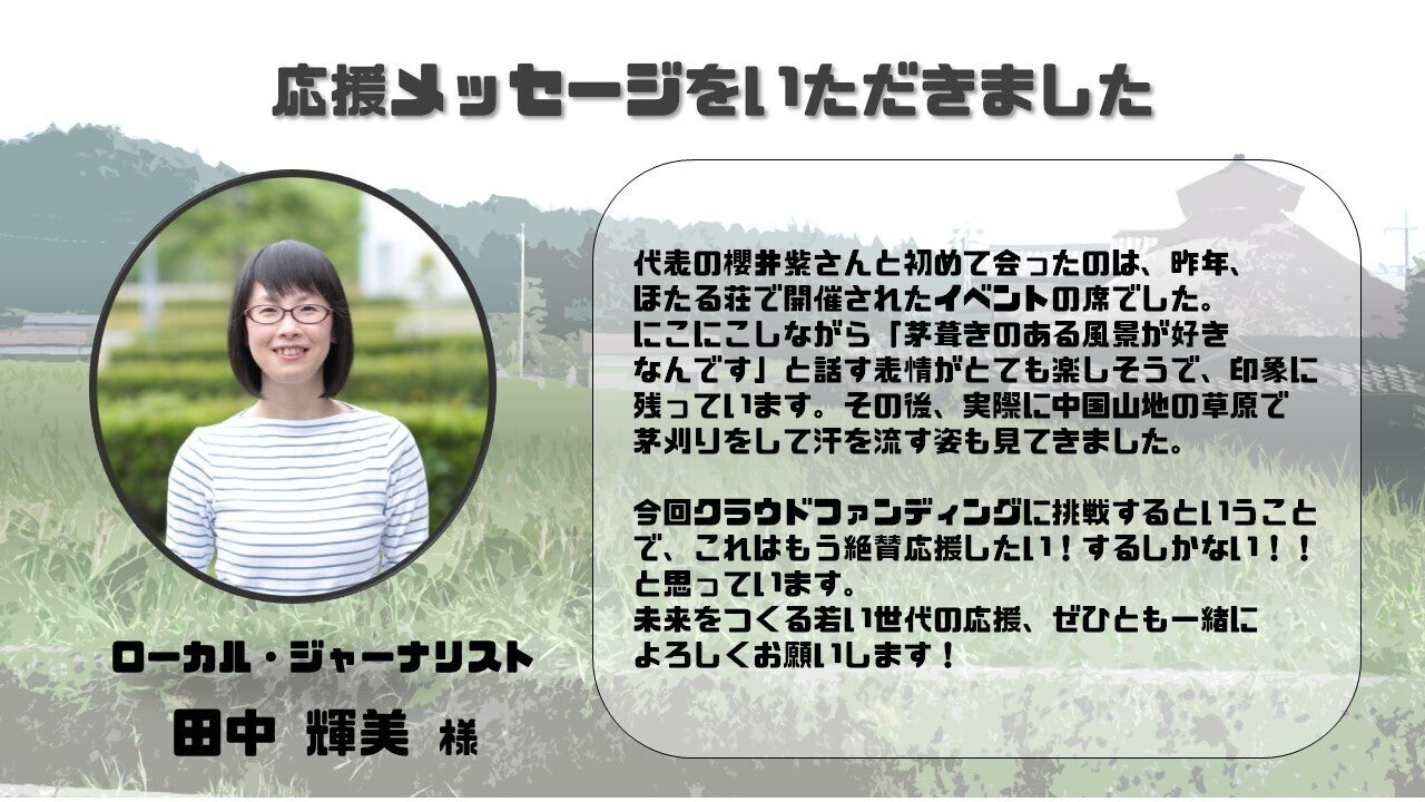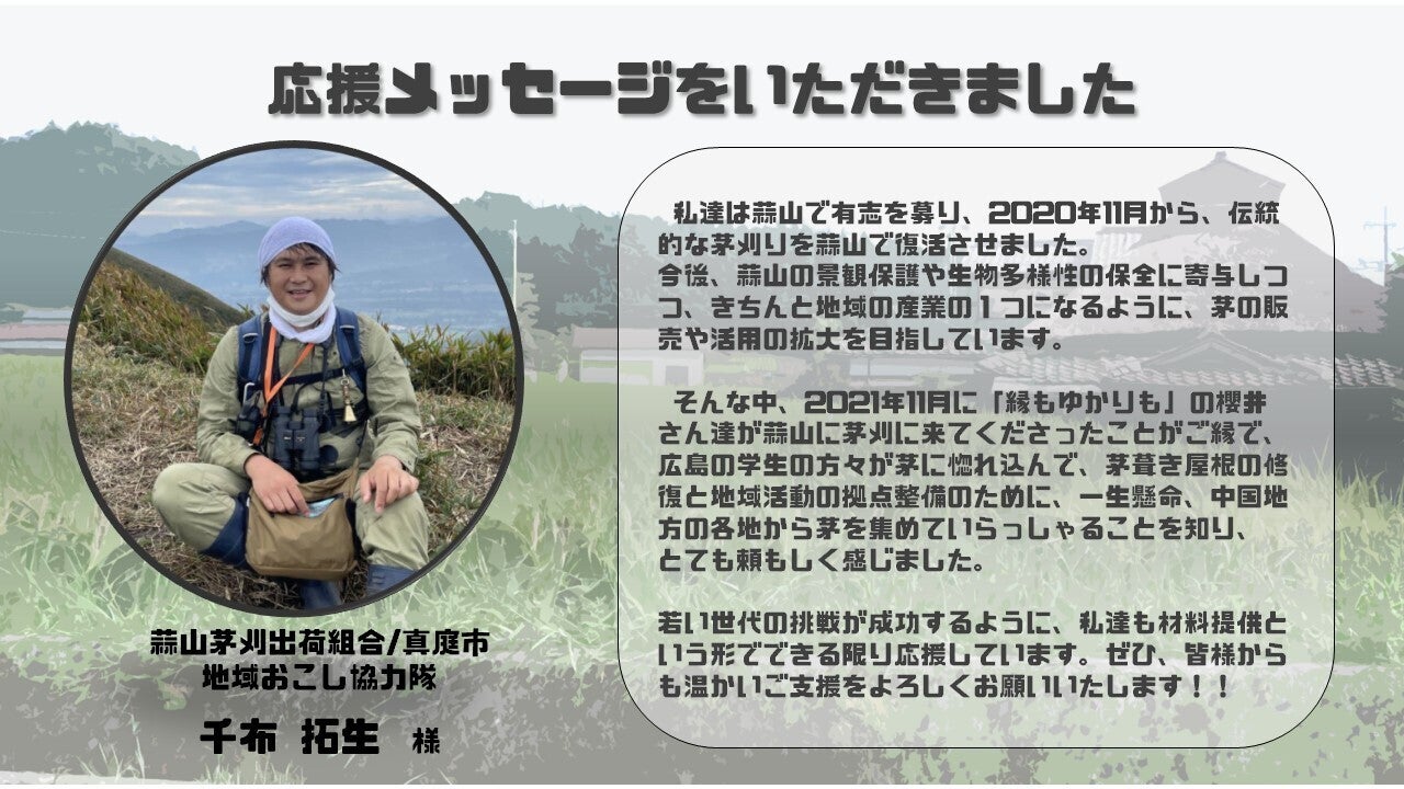 面白いことに、茅葺きはまちづくりにも深く関わっていたり、志和での他の地域活動のきっかけになったりしています。こうした実際の活動や人との出会い、草原との出会いもまた茅葺きから広がっていく世界があり、このクラウドファンディングの挑戦をきっかけに、志和地域の方々、学生、中国山地の方々、そして全国の皆さんが繋がって、どんどん仲間が増えたらいいなと思っています。